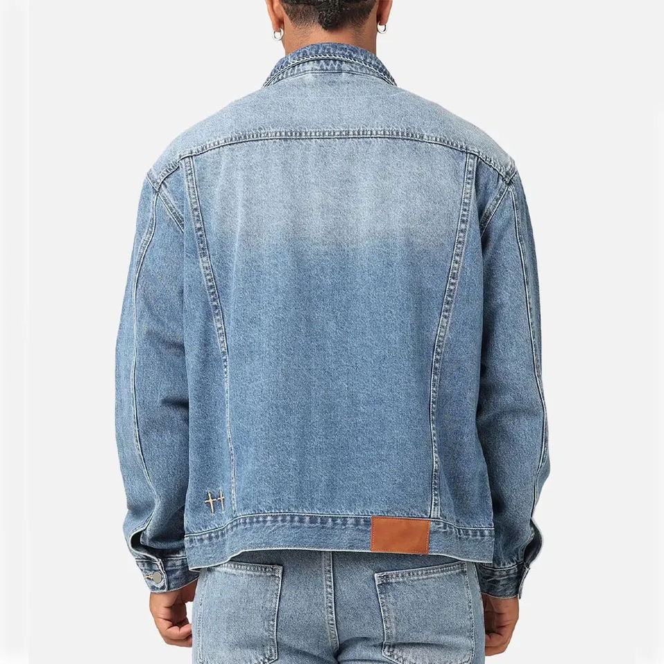 แจ็คเก็ตยีนส์ผู้ชายขายดี ผ้าฝ้าย 100% ดีไซน์สตรีทแฟชั่นสำหรับฤดูหนาว คุณภาพสูง ระบายอากาศได้ดี คอตั้ง โลโก้ด้านหน้า บริการ OEM