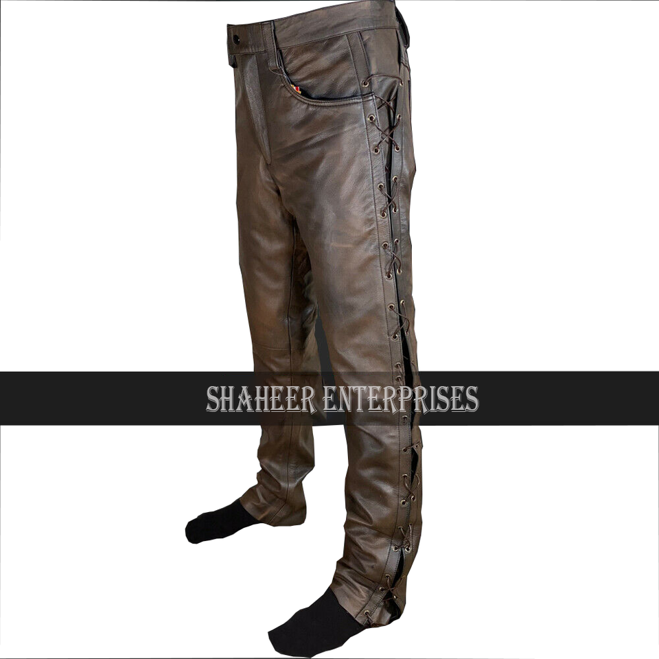 กางเกงขายาวผู้ชายสไตล์วินเทจลำลองสำหรับออกกำลังกาย ผ้าหนาปานกลาง แต่งลายปัก ขาดๆ แบบดิสเทรส พร้อมเชือกหนังแท้ ระบายอากาศได้ดี