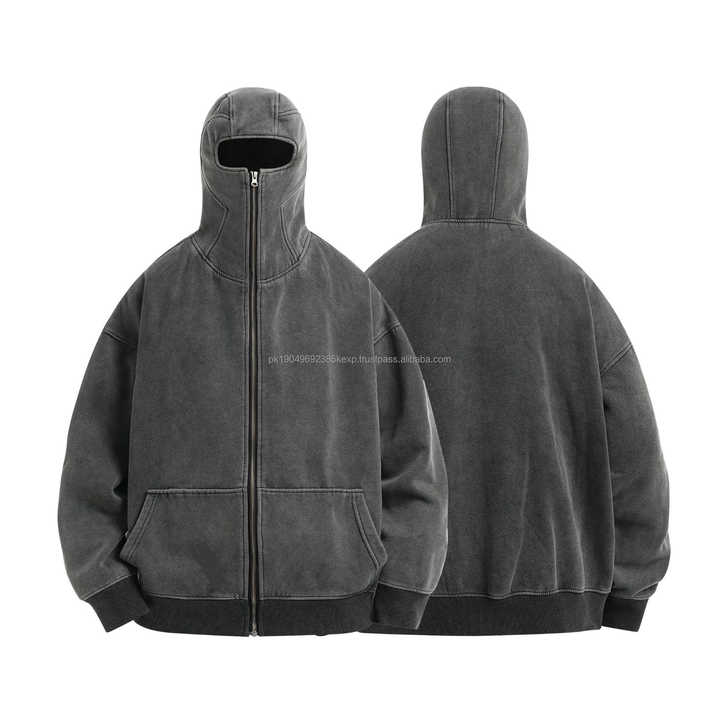 เสื้อฮู้ดดี้ผู้ชายขายดีสำหรับฤดูหนาว ผ้าคอตตอนหนานุ่ม สไตล์บาลาคลาวา ล้างสีแบบแอซิดวอช ซิปยาวเต็มตัว พิมพ์ลายดิจิทัล พร้อมฮู้ดคลุมหน้า