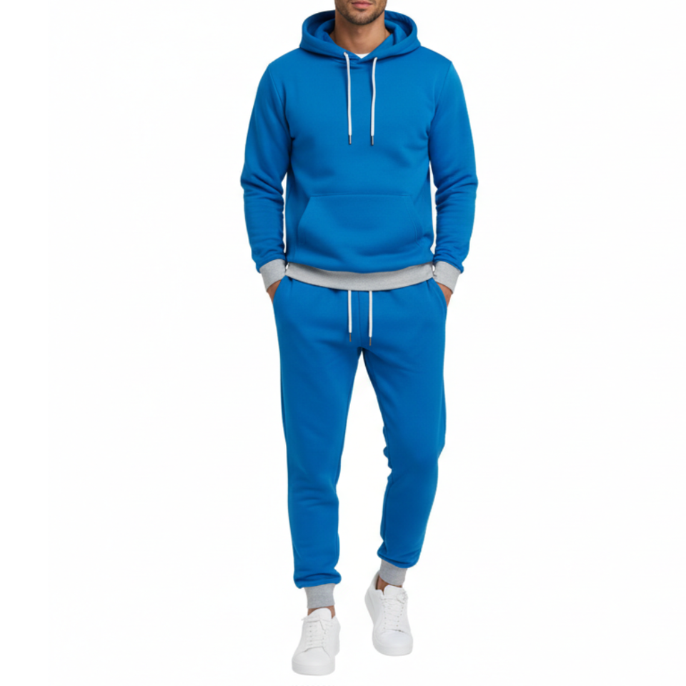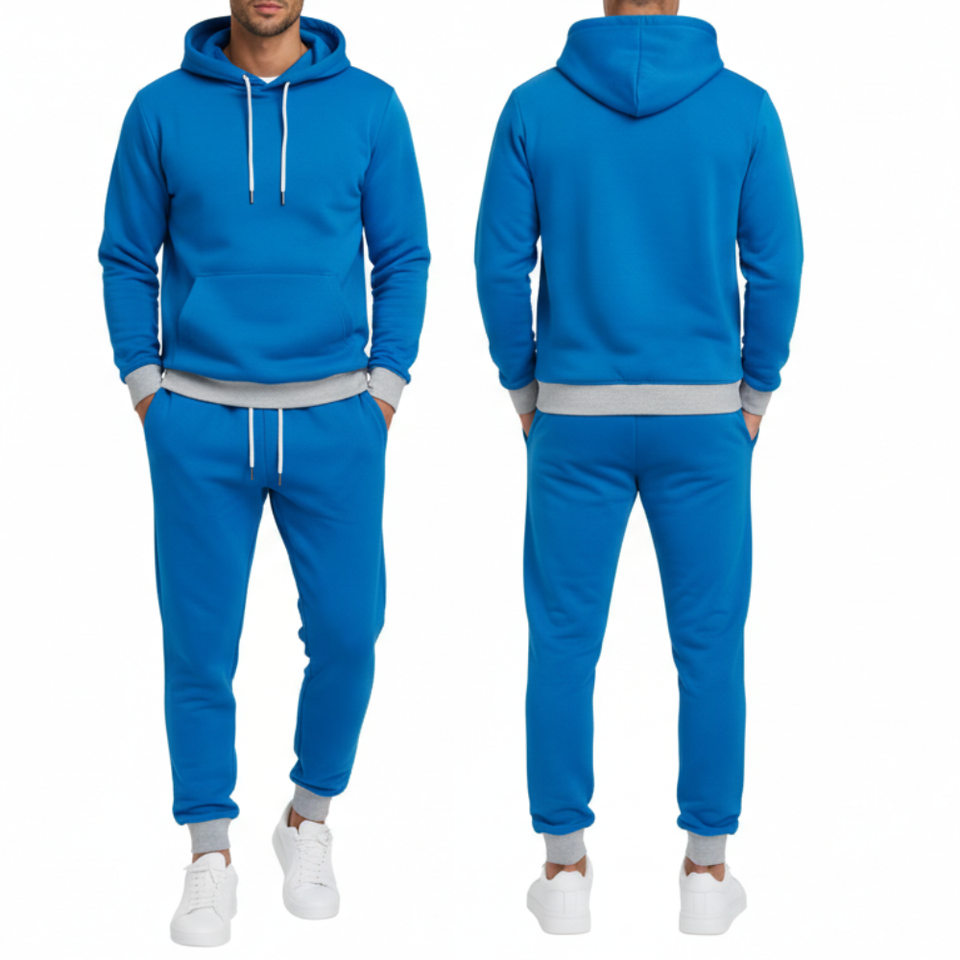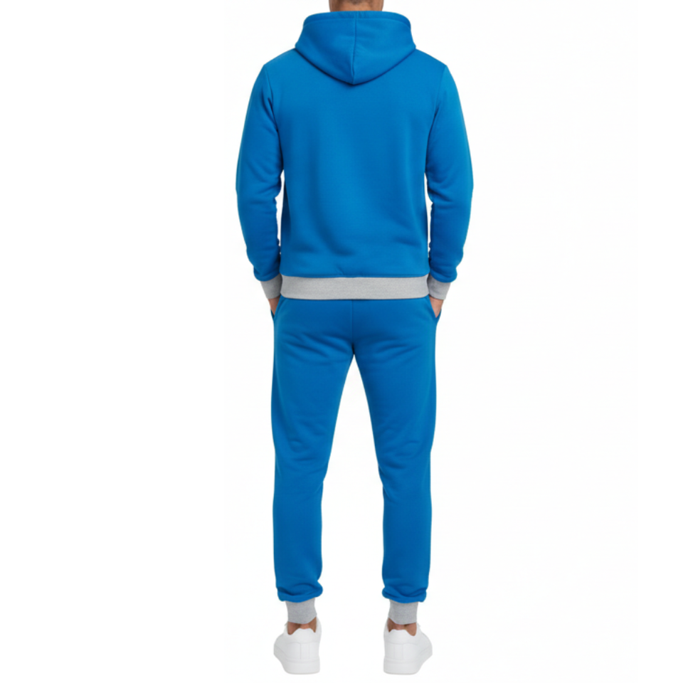 ชุดวอร์มผู้ชายขายดี สีฟ้าอิเล็กทริกและสีเทาตัดกัน ดีไซน์ฮู้ดดี้ แขนเสื้อแบบริบ ระบายอากาศได้ดี เหมาะสำหรับเล่นกีฬา