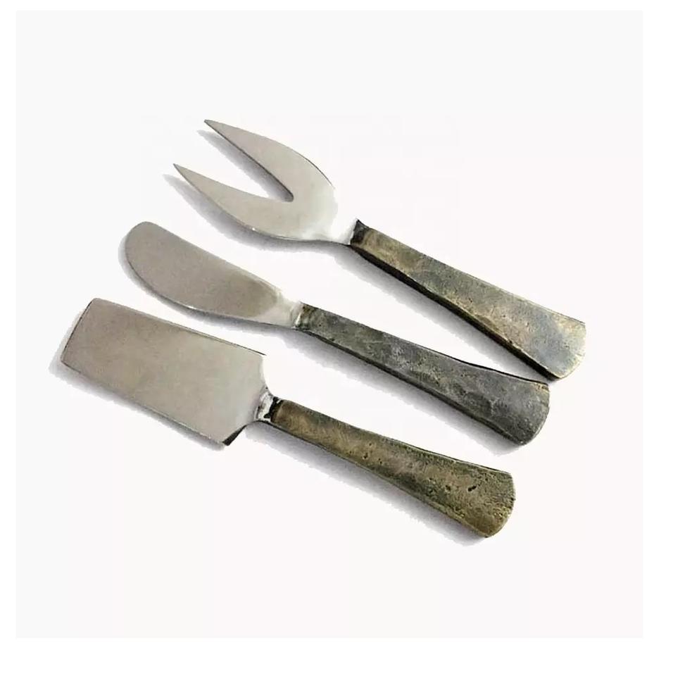 ชุดชีสโลหะขายดี 3 ชิ้น พร้อมด้ามจับตีขึ้นรูปด้วยมือ ชุดชีสโลหะใหม่สำหรับชีส ชุดช้อนส้อมโลหะแบบแบนใหม่ ราคาขายส่ง
