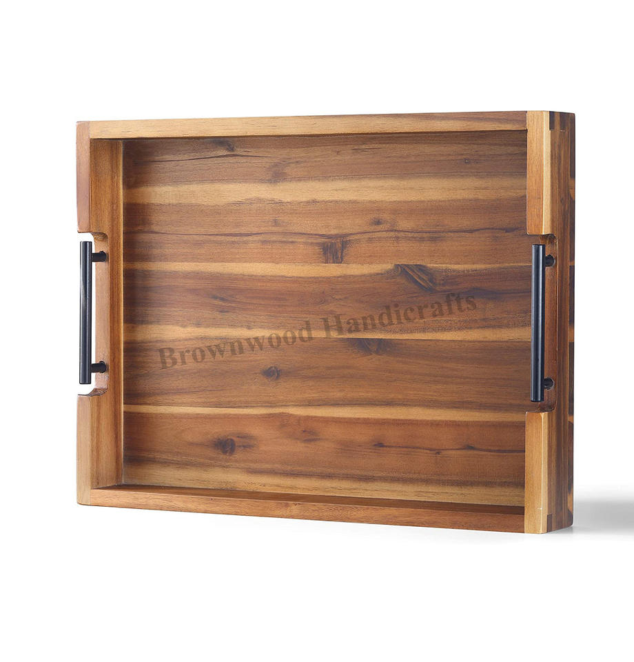 ถาดไม้อะคาเซียธรรมชาติพร้อมหูจับโลหะถาดไม้ปลอดภัยสำหรับอาหารที่บ้านและร้านอาหารเหมาะสำหรับการเสิร์ฟอาหารเช้า