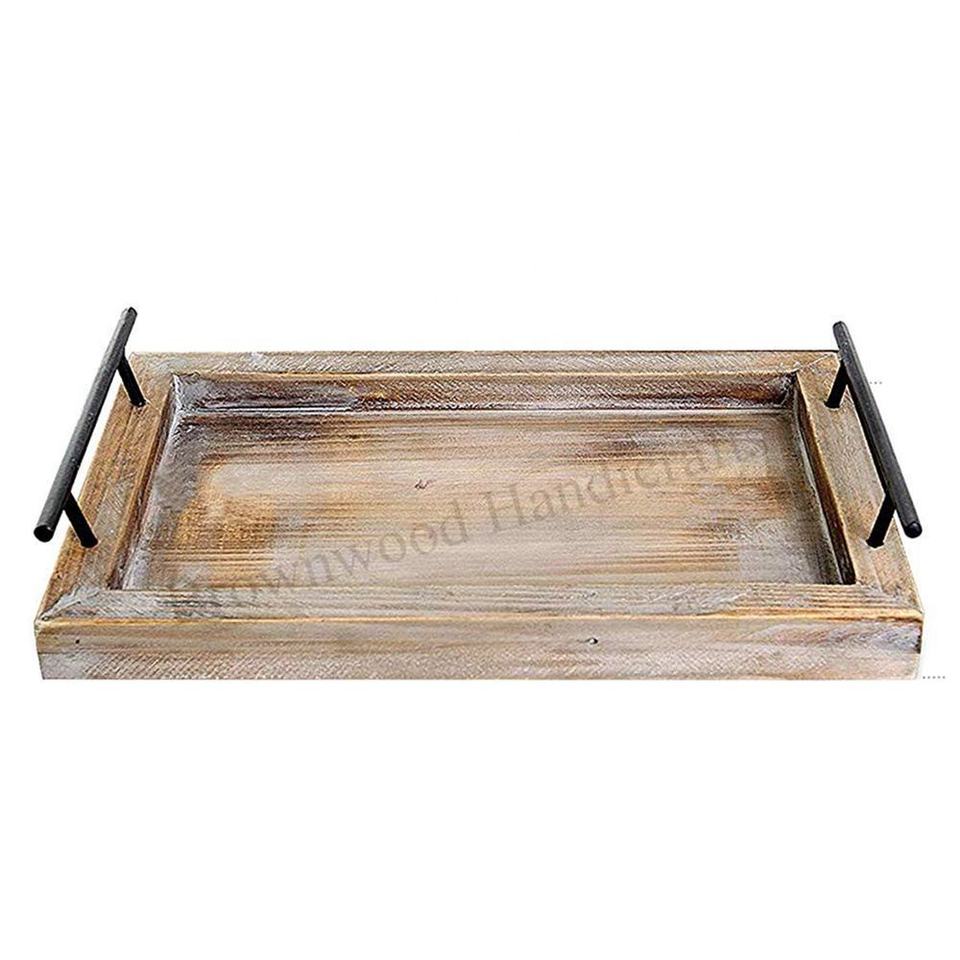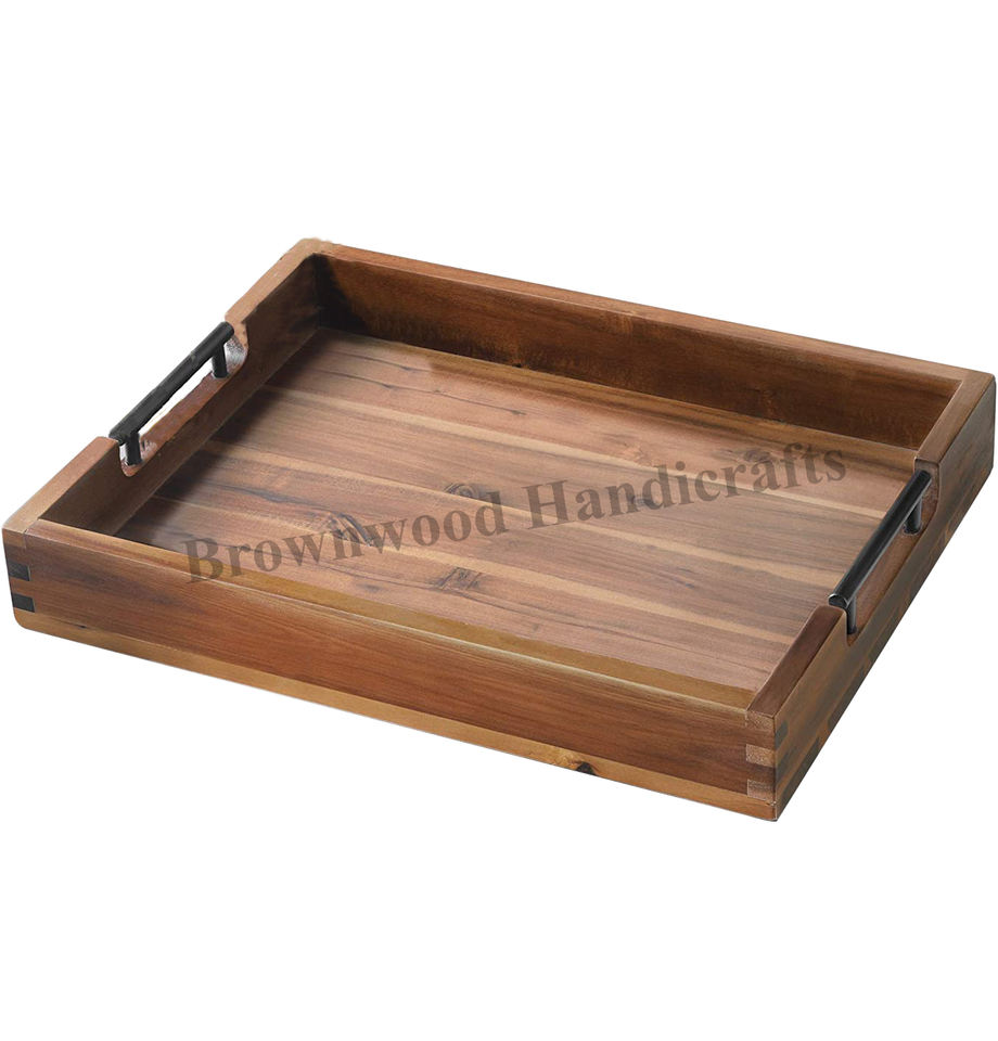 Wooden Rectangular Large Serving Tray With Metal Handles