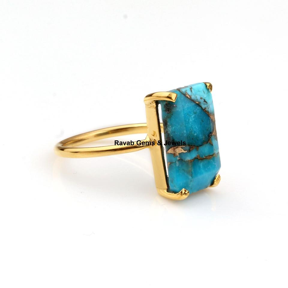 Natural Blue Copper Turquoise 925 Sterling Silver Gold Plated Ring