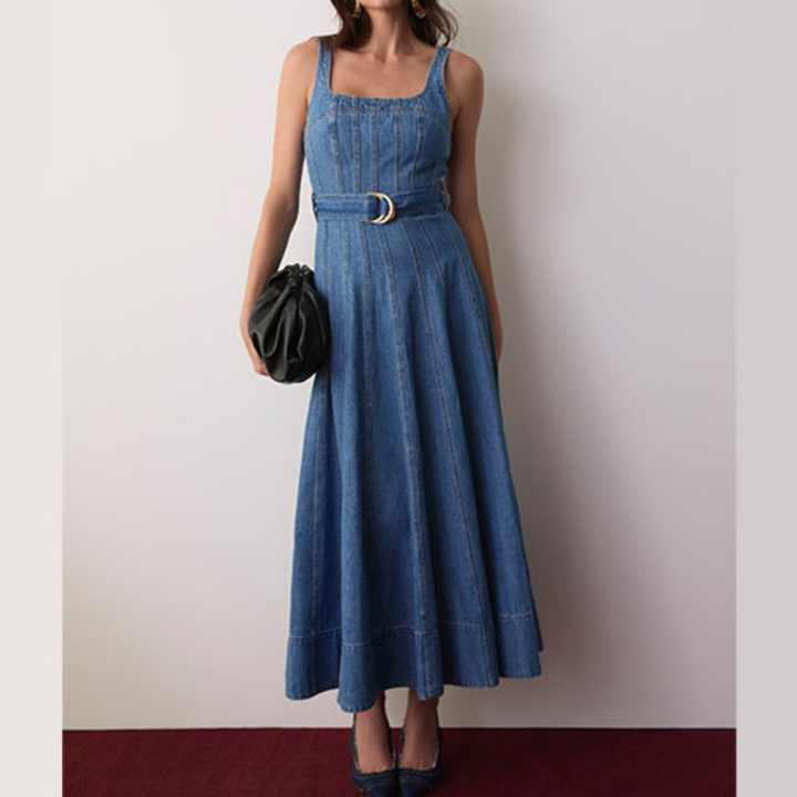 เดรสยีนส์มิดิผู้หญิงแบบใหม่มาแรง ขายดี ตัดเย็บตามสั่ง ซิปหลัง ผ้าฝ้าย แขนกุด คอเหลี่ยม สำหรับผู้หญิง
