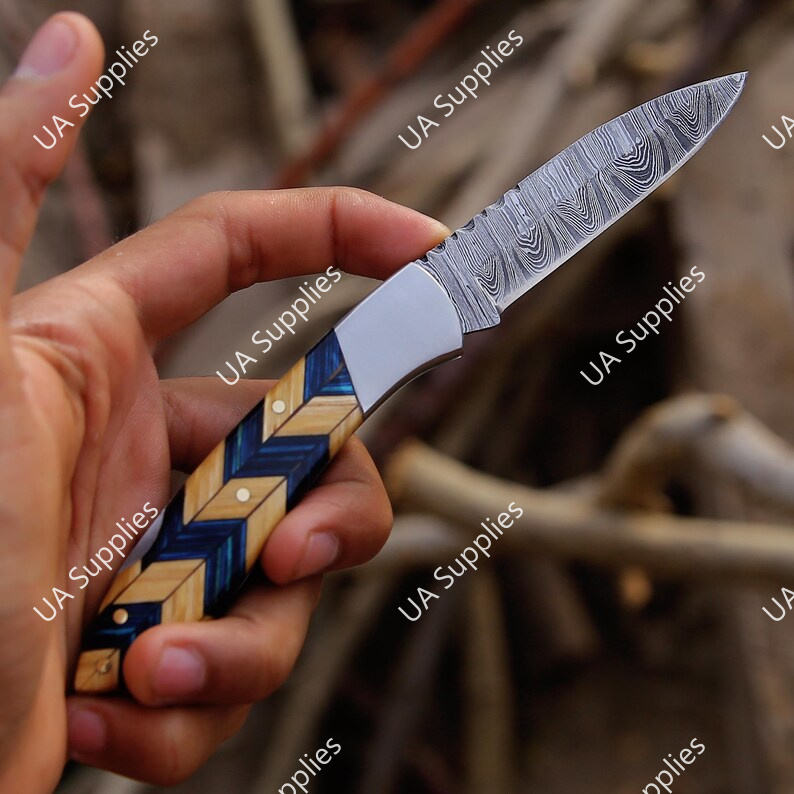 มีดพับ EDC ดีไซน์ใหม่ ขายดี ปี 2026 ทำจากเหล็กดามัสกัส งานแฮนด์เมด ปลายมีดแบบ Drop Point ด้ามไม้ Pakka สีเขียวมะกอก สำหรับอุตสาหกรรม รับผลิตแบบ OEM