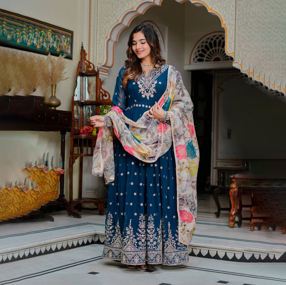 ชุดเดรส anarkali ดีไซเนอร์แฟชั่นใหม่สำหรับผู้หญิงแขนยาวผ้าจอร์เจียอินเดียงานปาร์ตี้
