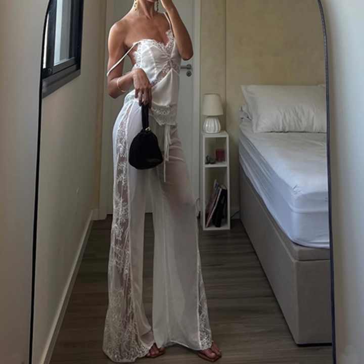 ชุดเซ็ตผู้หญิงสุดฮอต ขายดี คุณภาพสูง ผ้าลูกไม้เซ็กซี่ เสื้อกล้าม กางเกงขาบาน ชุดสองชิ้น สำหรับสาวๆ