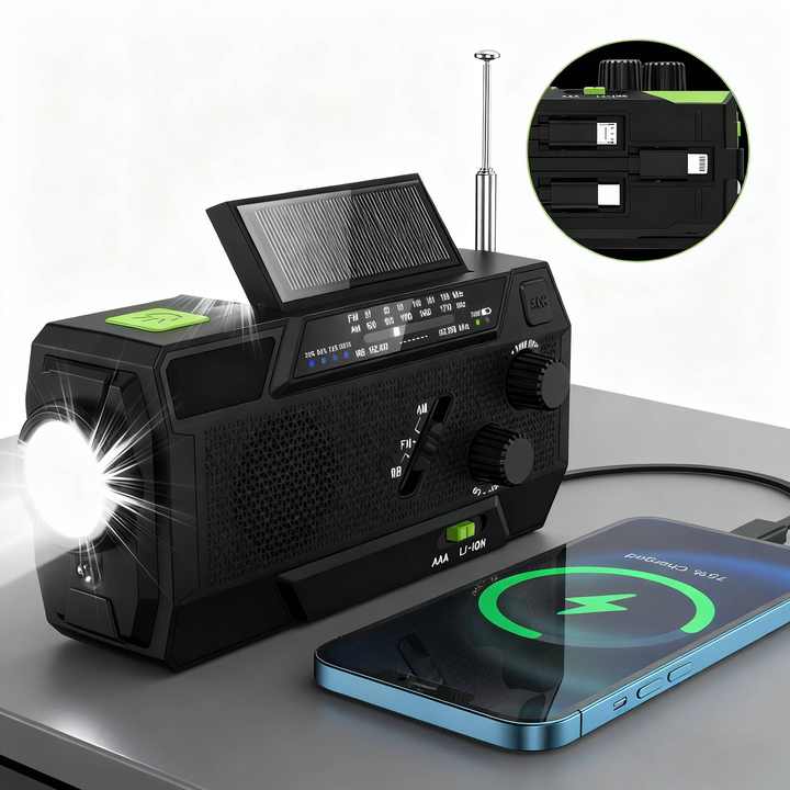 วิทยุพกพาฉุกเฉินกลางแจ้งขายดี พร้อมไฟฉาย LED วัสดุ ABS ใช้พลังงานแสงอาทิตย์ ชาร์จด้วยมือหมุน ใช้เป็นพาวเวอร์แบงค์ได้