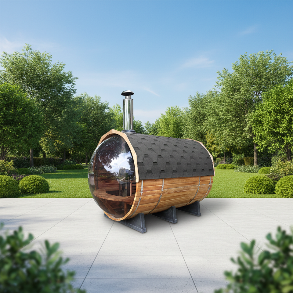ซาวน่าไม้กลางแจ้งแบบถังไม้เนื้อแข็งขายดี ปรับแต่งได้สำหรับ 4-6 คน พร้อมเตาเผาไม้สำหรับอบไอน้ำ