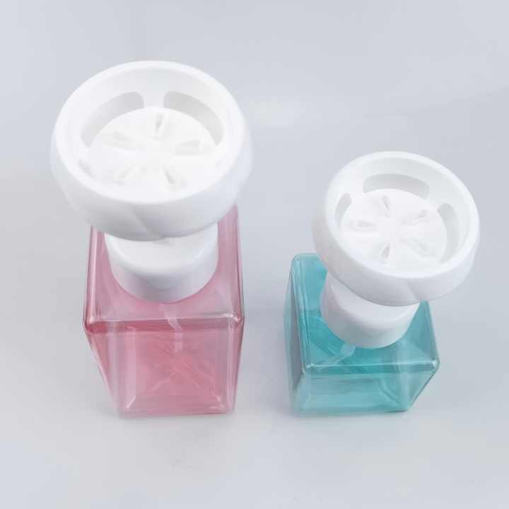 ขวดโฟมสี่เหลี่ยมสีชมพู ฟ้า เขียว ขาว ขนาด 5oz 6oz 8oz ขายดี คุณภาพดี รูปทรงดอกไม้ พร้อมหัวปั๊ม
