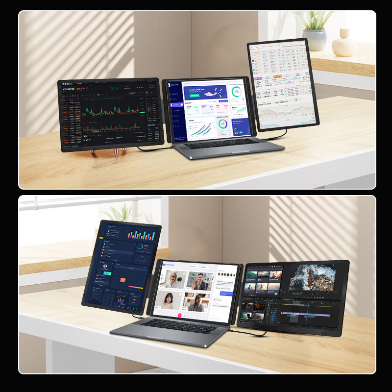 จอภาพพกพาแบบสามจอขนาด 16 นิ้ว ขายดี พร้อมใช้งานทันที หน้าจอ IPS อัตราส่วน 16:10 แผงหน้าจอถอดออกได้ และขาตั้งโลหะปรับระดับได้