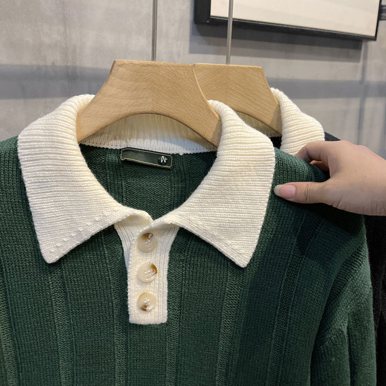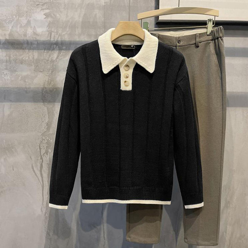 เสื้อสเวตเตอร์คอปกโปโลถักไหมพรมอุ่นๆ สีสันตัดกัน กระดุมติดปก สไตล์เรโทรลำลอง แขนยาว ใส่ได้ทั้งชายและหญิง ขายดี