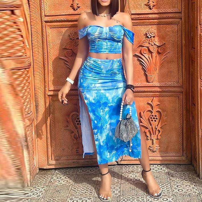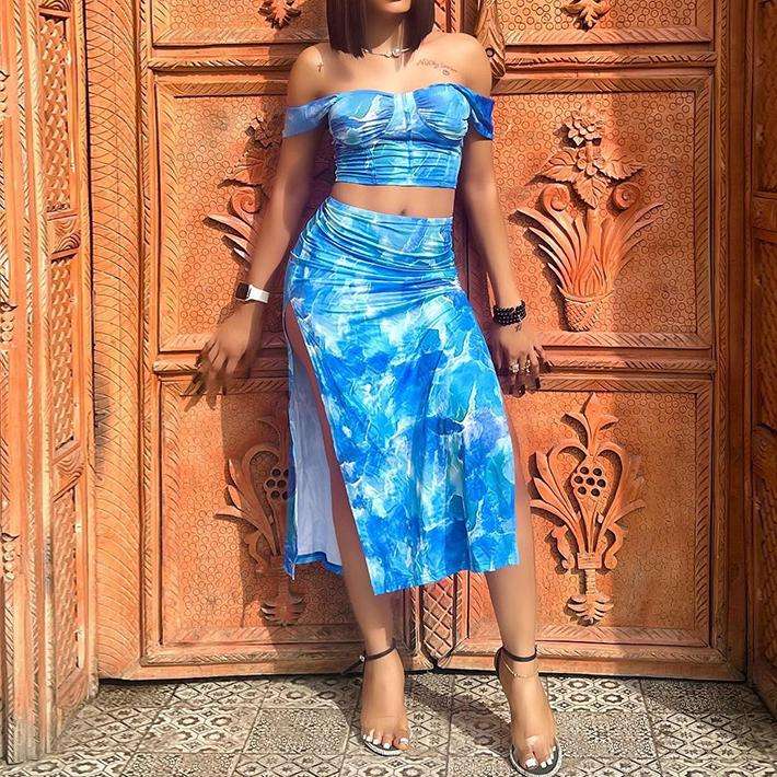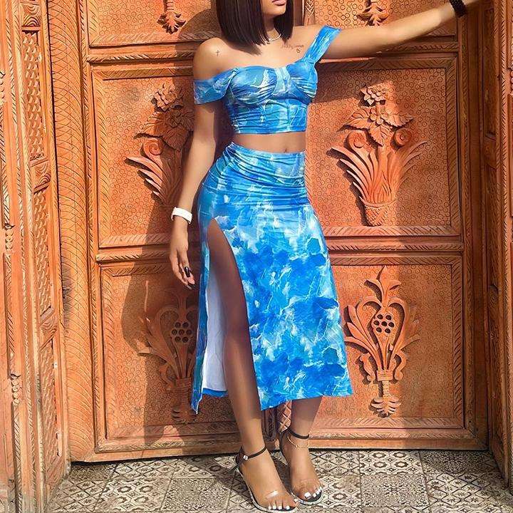 ชุดเซ็ต 2 ชิ้น เสื้อครอปเปิดไหล่พิมพ์ลาย กระโปรงผ่าข้าง แฟชั่นขายดี