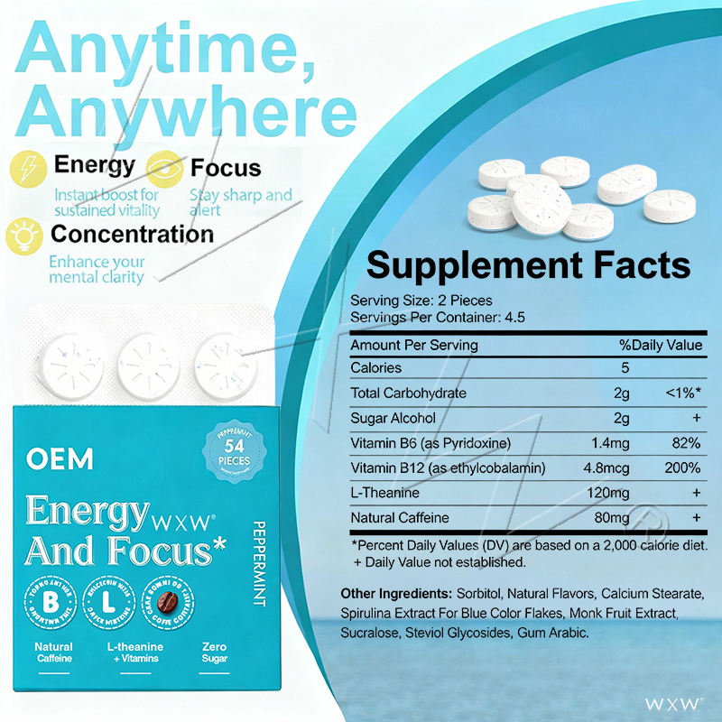 ยาเม็ดเสริมพลังงานแบรนด์ส่วนตัวขายดี คาเฟอีนธรรมชาติ แอล-ธีอะนีน เพื่อความสดชื่นและสงบ