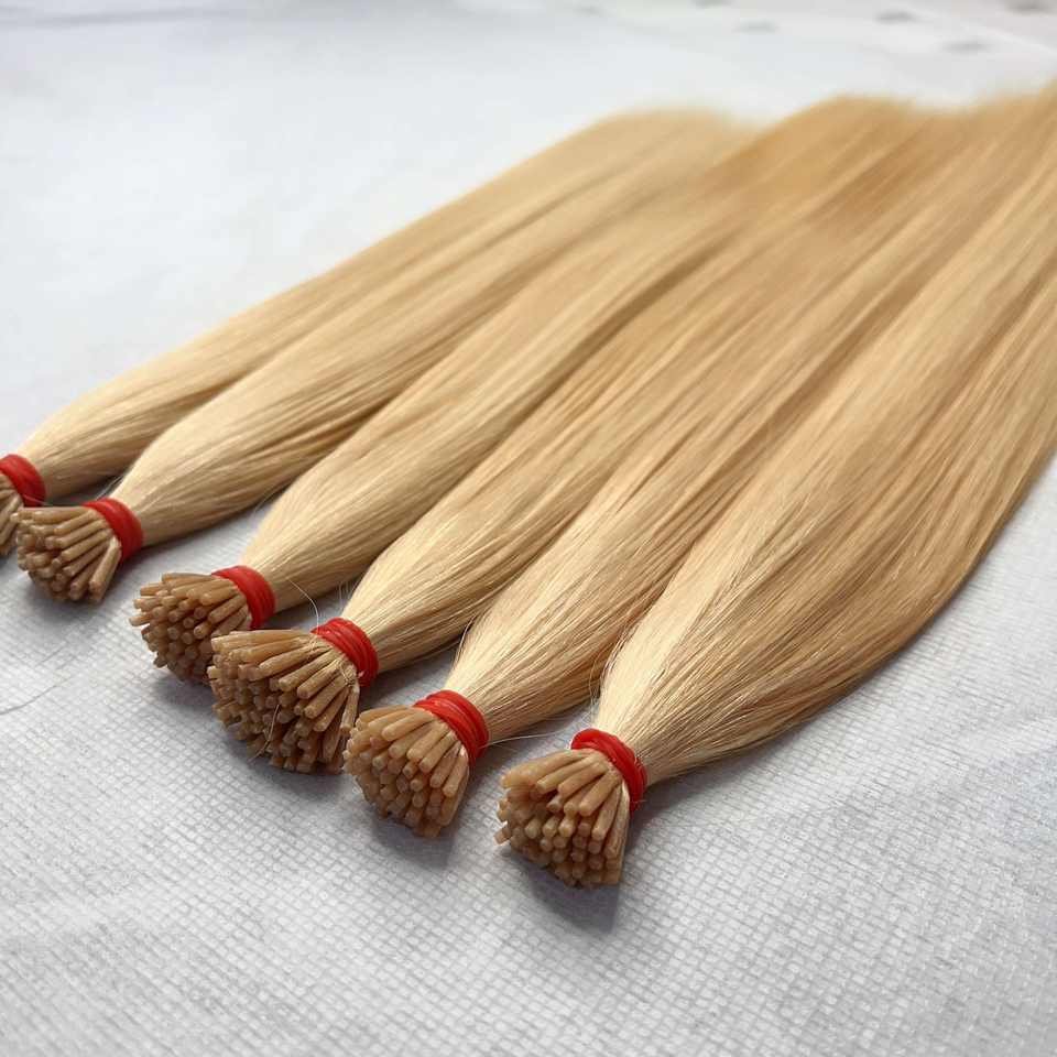 สินค้าขายดี ผมแท้ 100% ต่อผมแบบเคราติน ปลายผมหรูหรา ซุปเปอร์ดับเบิ้ลดรอน แบบ I-Tips สีบลอนด์ ผมตรง