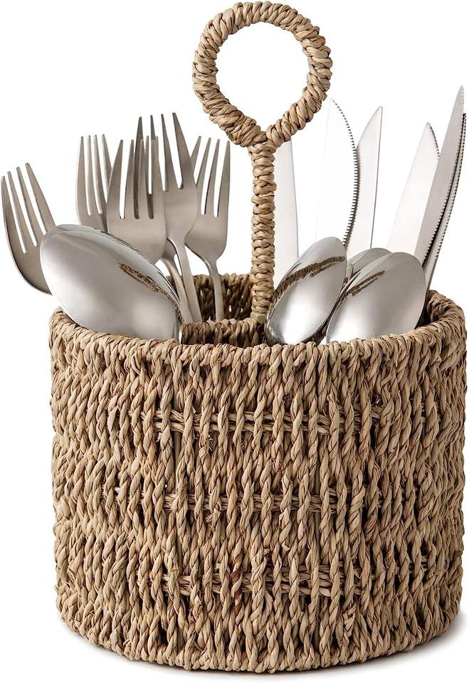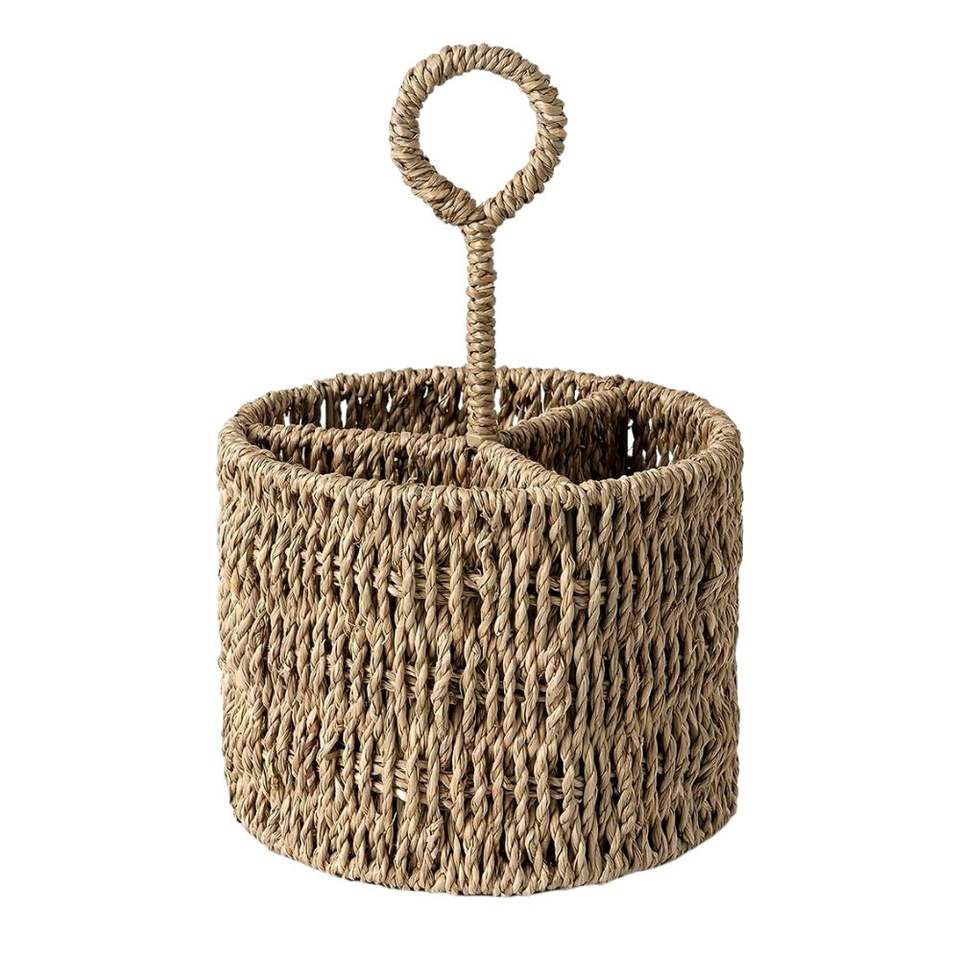 Hot Selling Round Wicker Basket, Flatware Organizer with Handle Hand-woven Seagrass Cutlery Storage Baskets for Countertop