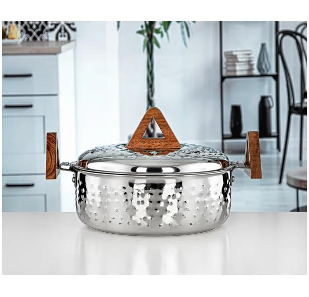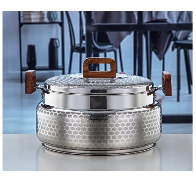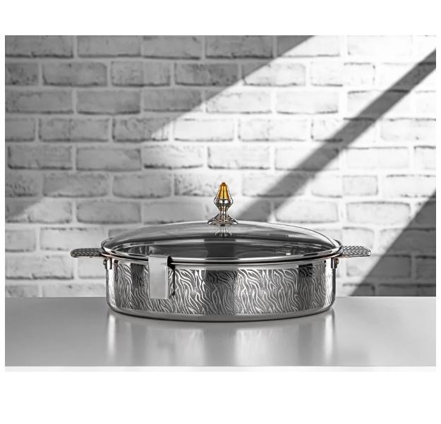 หม้อไฟทรงกลมสแตนเลสสีเงินขายดี พร้อมฝาปิด ดีไซน์สวยงาม ใช้สำหรับงานแต่งงาน งานเลี้ยง และตกแต่งบ้าน