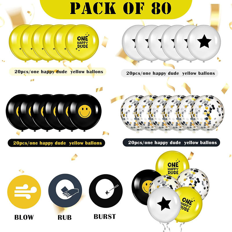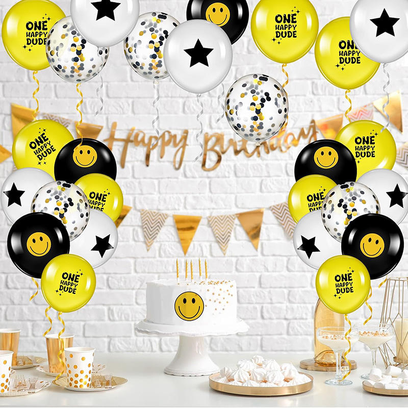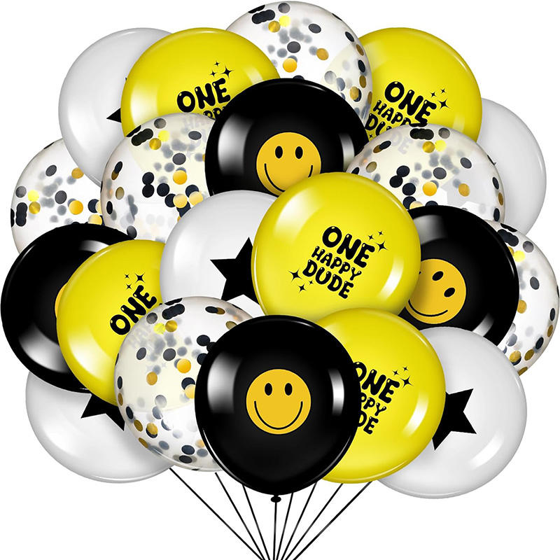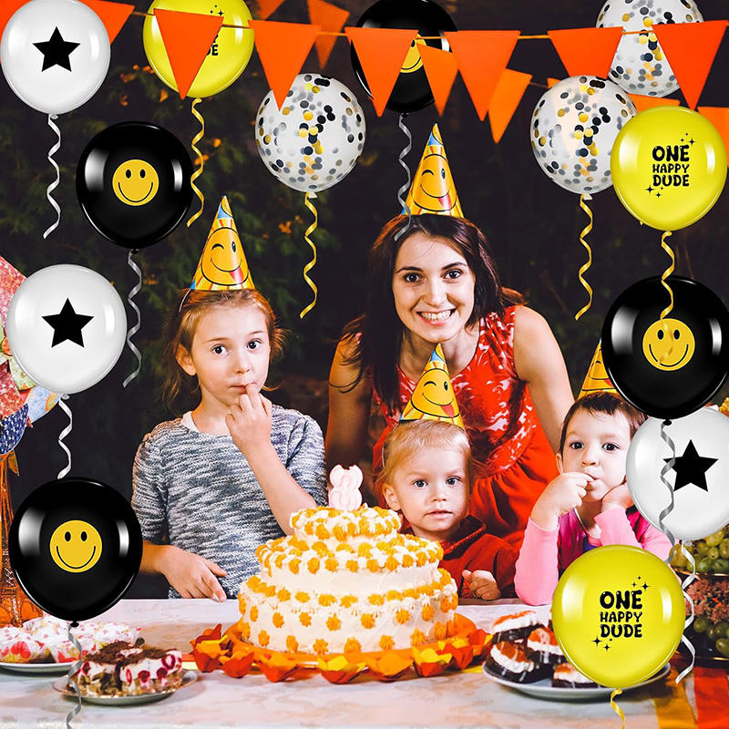 ลูกโป่งลาเท็กซ์พิมพ์ลายหน้ายิ้มสำหรับงานปาร์ตี้ธีมฮิปปี้สุขสันต์วันเกิดหนึ่งตกแต่งด้วยลูกโป่งยางพารา