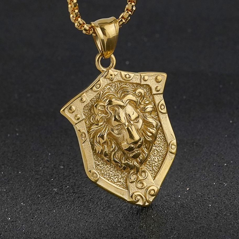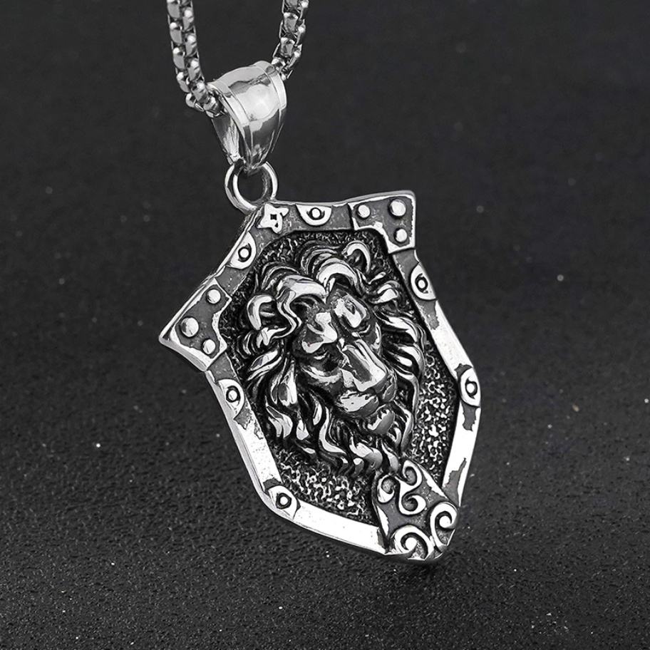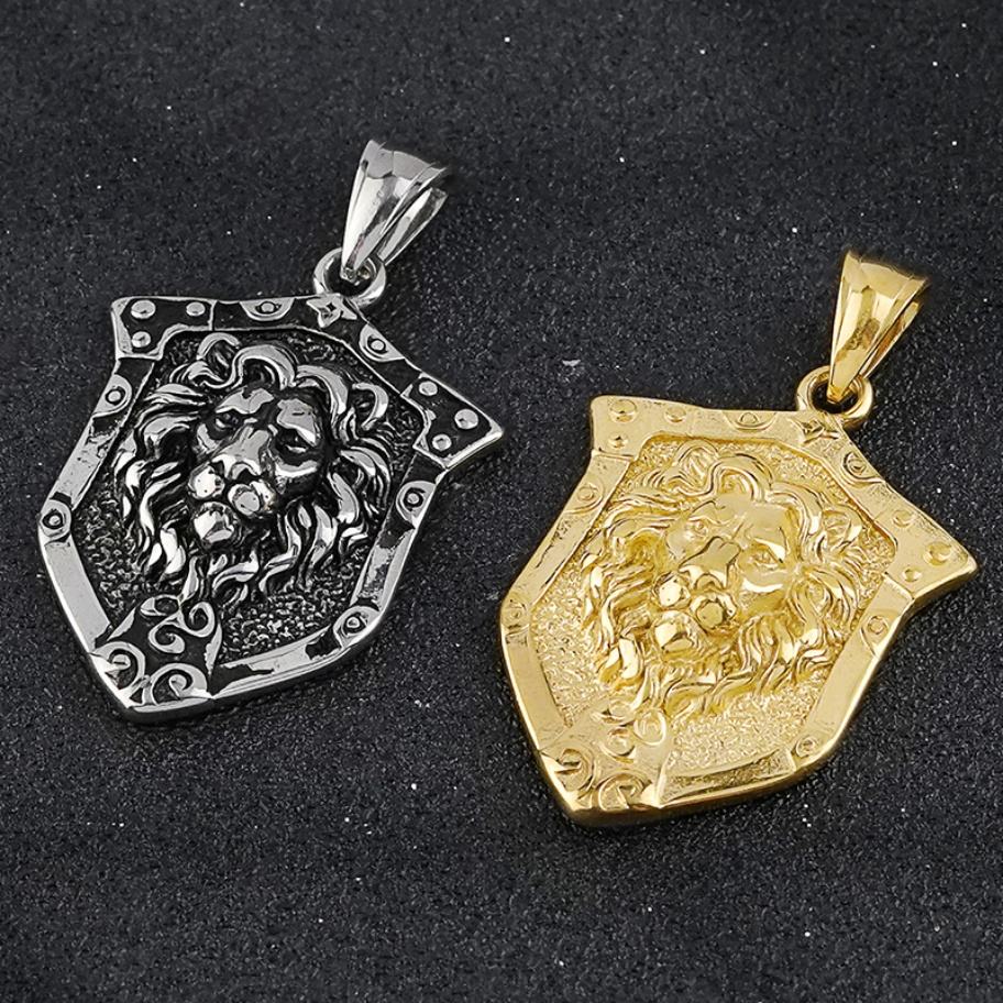 จี้รูปโล่สิงโตสแตนเลสขายดี สร้อยคอฮิปฮอปสไตล์พังก์สำหรับผู้ชาย เครื่องประดับสำหรับผู้ชาย