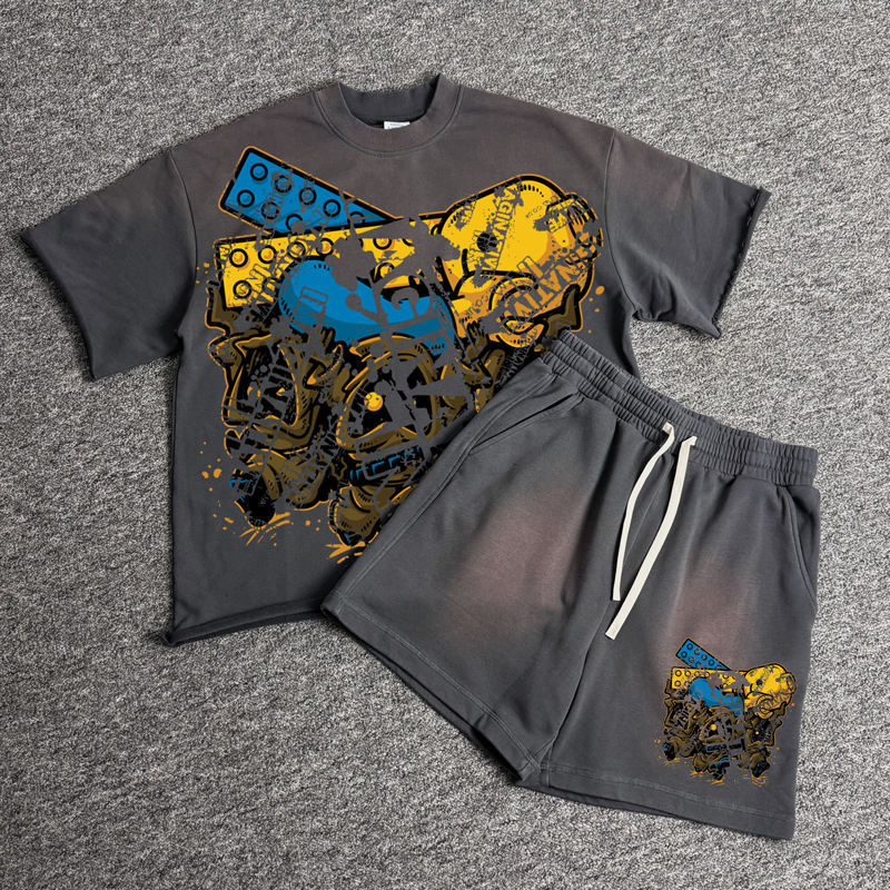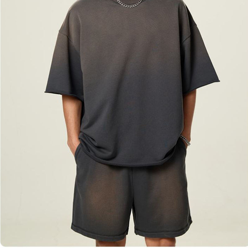 เสื้อยืดและกางเกงขาสั้นลำลองผู้ชายขายดี ชุดเซ็ตเปล่าสำหรับสกรีนลาย พิมพ์ลายได้ ล้างสีแบบ Distress Acid Wash ทรงโอเวอร์ไซส์ ลายเสือดาว แห้งเร็ว