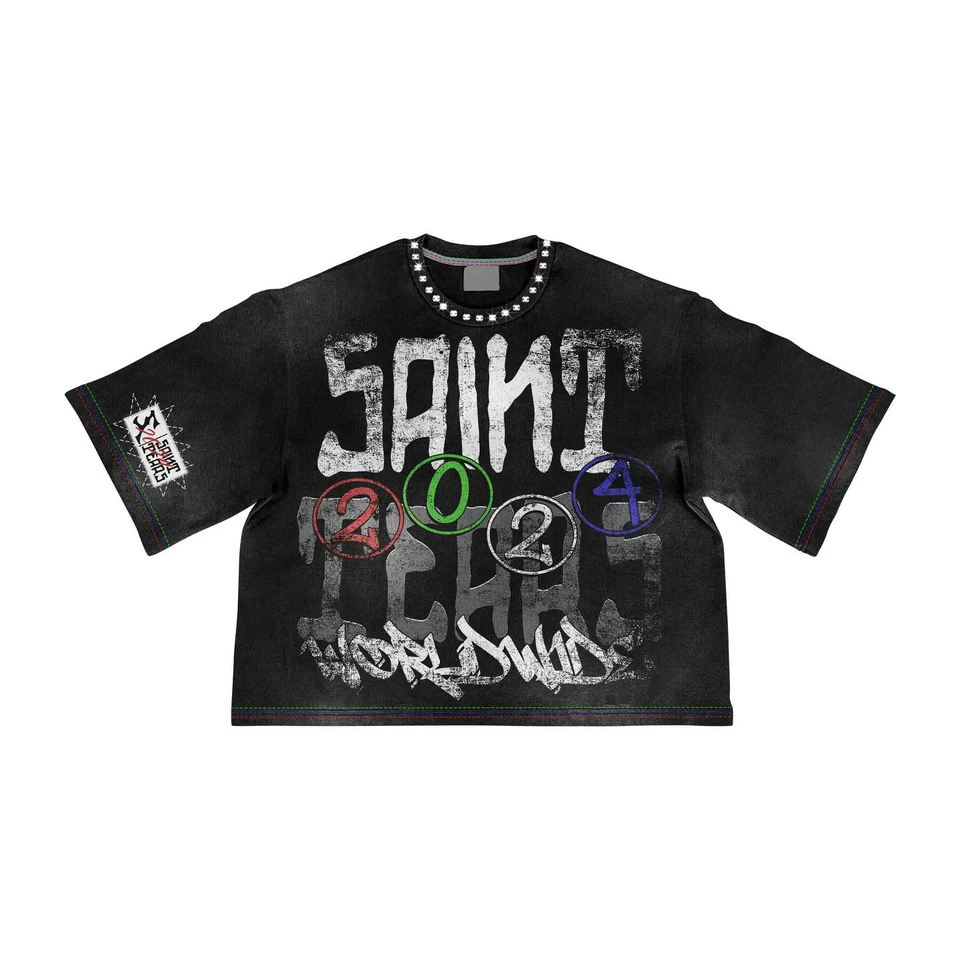 เสื้อยืดขายดี กางเกงขาสั้น ชุดลายกราฟิกมหาวิทยาลัย เสื้อยืดทรงครอปแบบวินเทจประดับหมุด และกางเกงยีนส์ขาสั้น ชุดสตรีทแวร์สองชิ้น