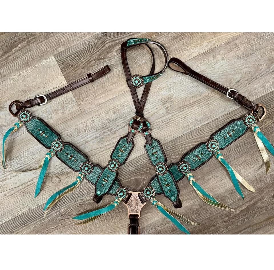 ชุดขี่ม้าหนังจระเข้สีเทอร์ควอยซ์ประดับดอกไม้