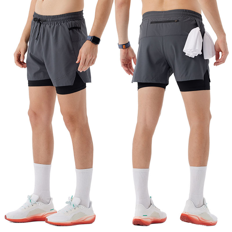 กางเกงออกกำลังกายขาสั้นสองชั้นของผู้ชายกางเกงขาสั้นออกกำลังกายแห้งเร็ว