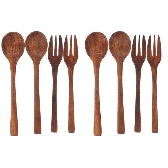 ชุดช้อนส้อมไม้ดีไซน์ไม่ซ้ำใครในรูปทรงและขนาดที่น่าดึงดูดซึ่งส่วนใหญ่ใช้ในร้านอาหารโรงแรม