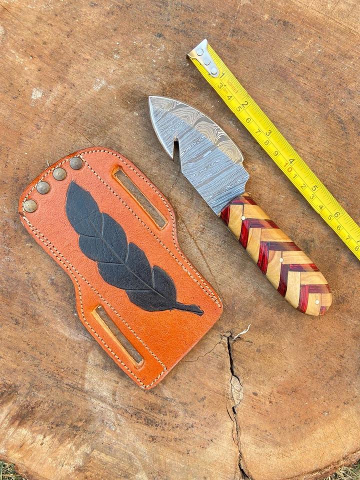 มีดล่าสัตว์เหล็กดามัสกัส ดีไซน์ด้ามไม้สุดพิเศษ ขายดี พร้อมปลอกหนัง มีดใบตายสำหรับตั้งแคมป์และปอกเนื้อ