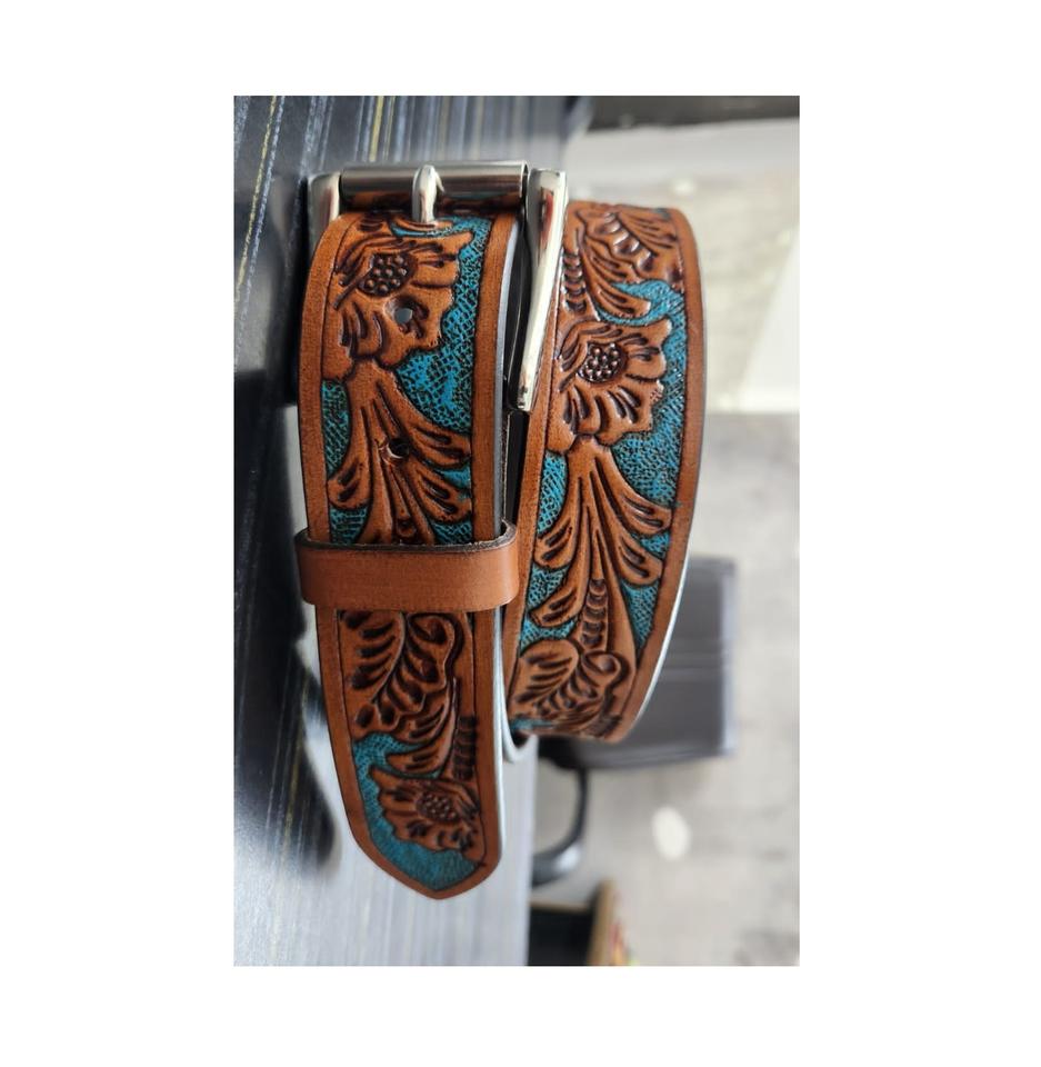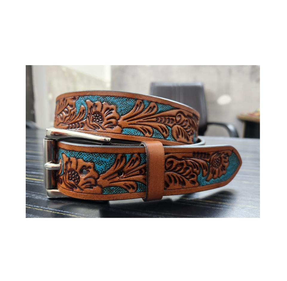 เข็มขัดหนังม้าสีน้ำตาลเทอร์ควอยซ์ลายดอกไม้สำหรับทุกเพศเข็มขัดลูกปัดหัวเข็มขัดแฟนซีออกแบบได้ตามต้องการ
