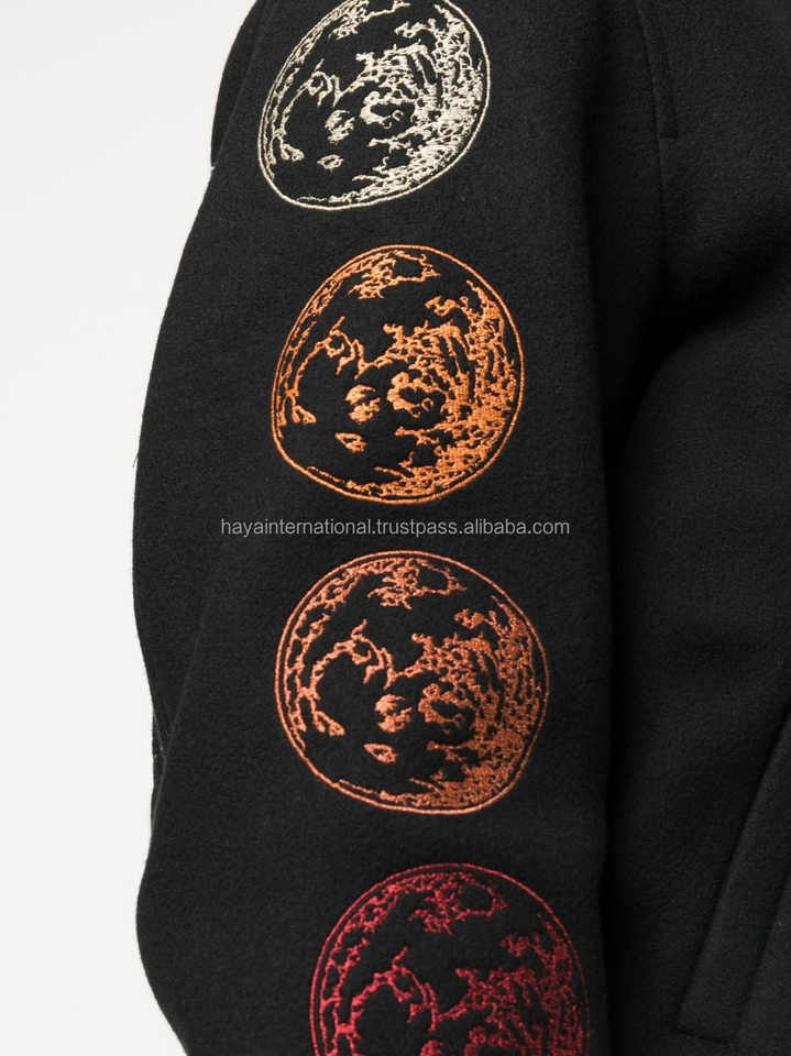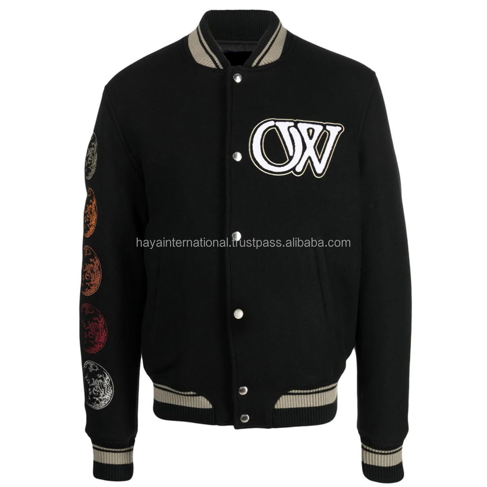 เสื้อแจ็คเก็ตผ้าขน100% สีดำล้วนปักลายแขนเสื้อหนังคอตั้งโลโก้ด้านหน้าผ้าแคนวาส HIVJ54
