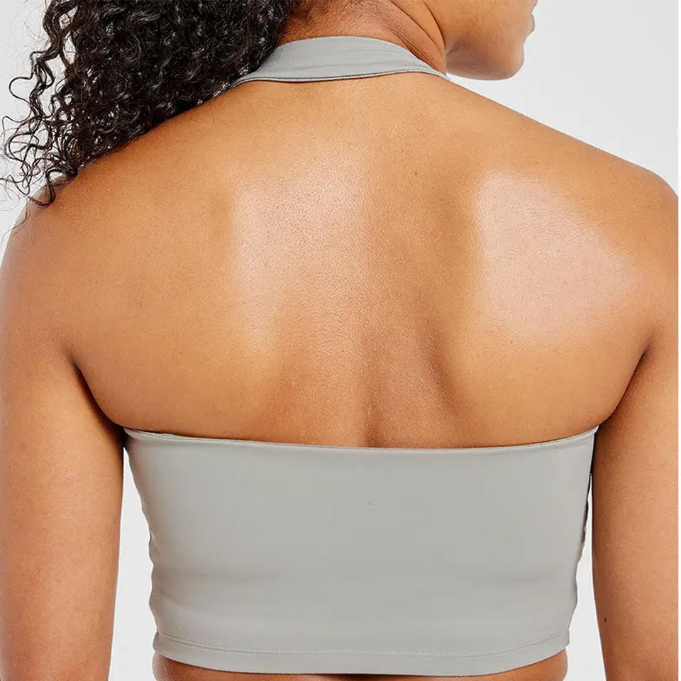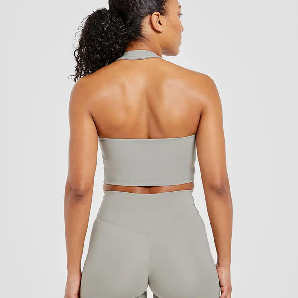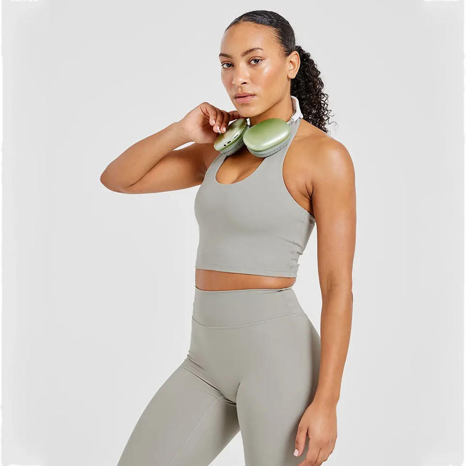 เสื้อครอปท็อปผู้หญิงแบบผูกคอ สีเขียวมะกอก ซักแล้ว ใส่สบาย ยืดหยุ่น เบาบาง เหมาะสำหรับออกกำลังกาย ขายดีช่วงซัมเมอร์ เป็นมิตรต่อสิ่งแวดล้อม
