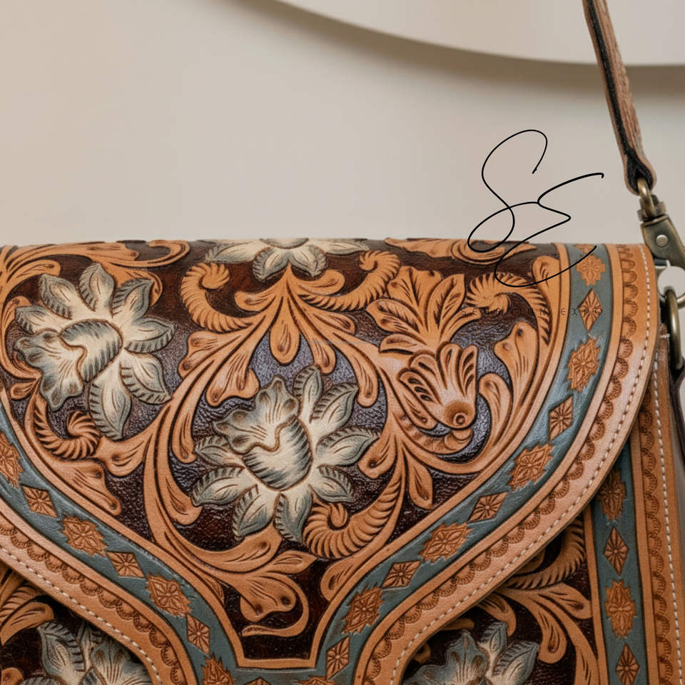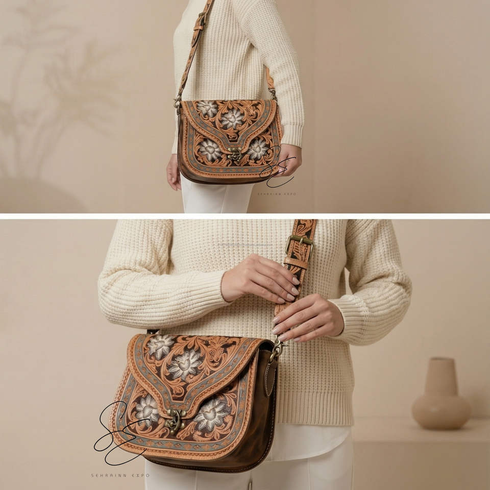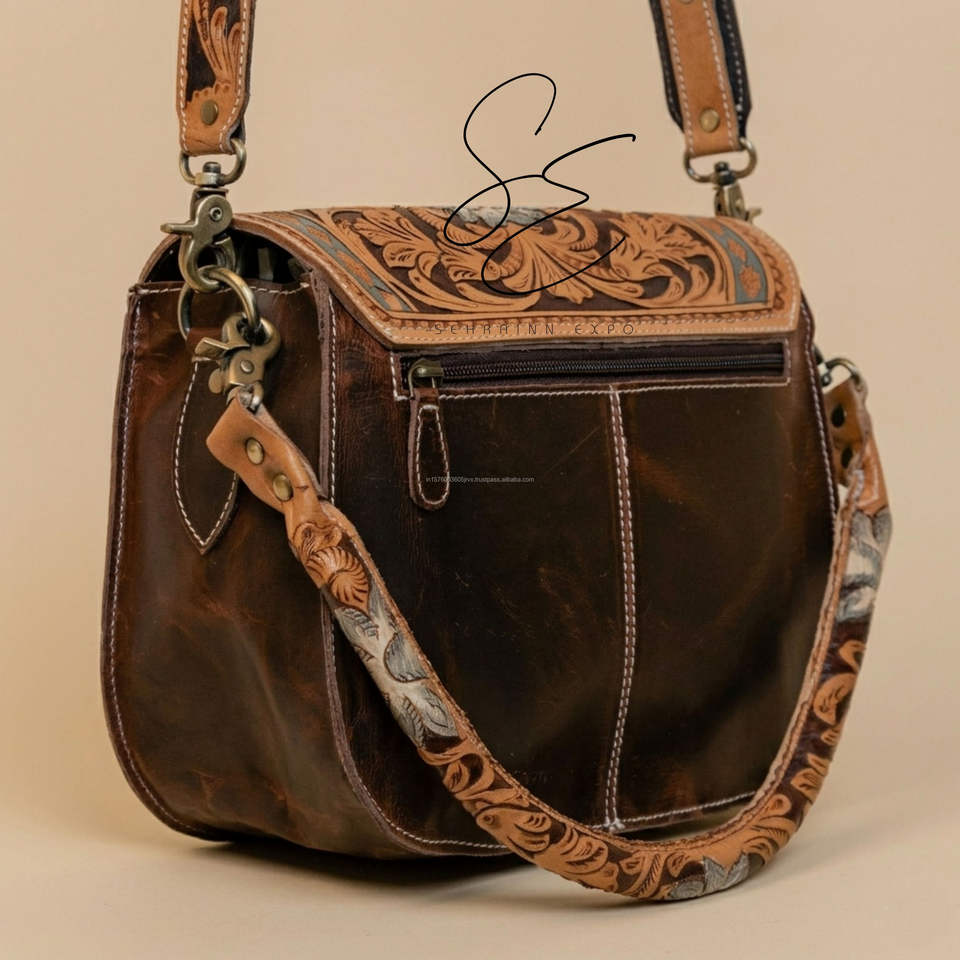 กระเป๋าหนังลายดอกไม้ทำด้วยมือแบบตะวันตกกระเป๋าพาดลำตัวหนังคาวเกิร์ลที่มีด้ามจับเครื่องมือกระเป๋าหนังสั่งทำ