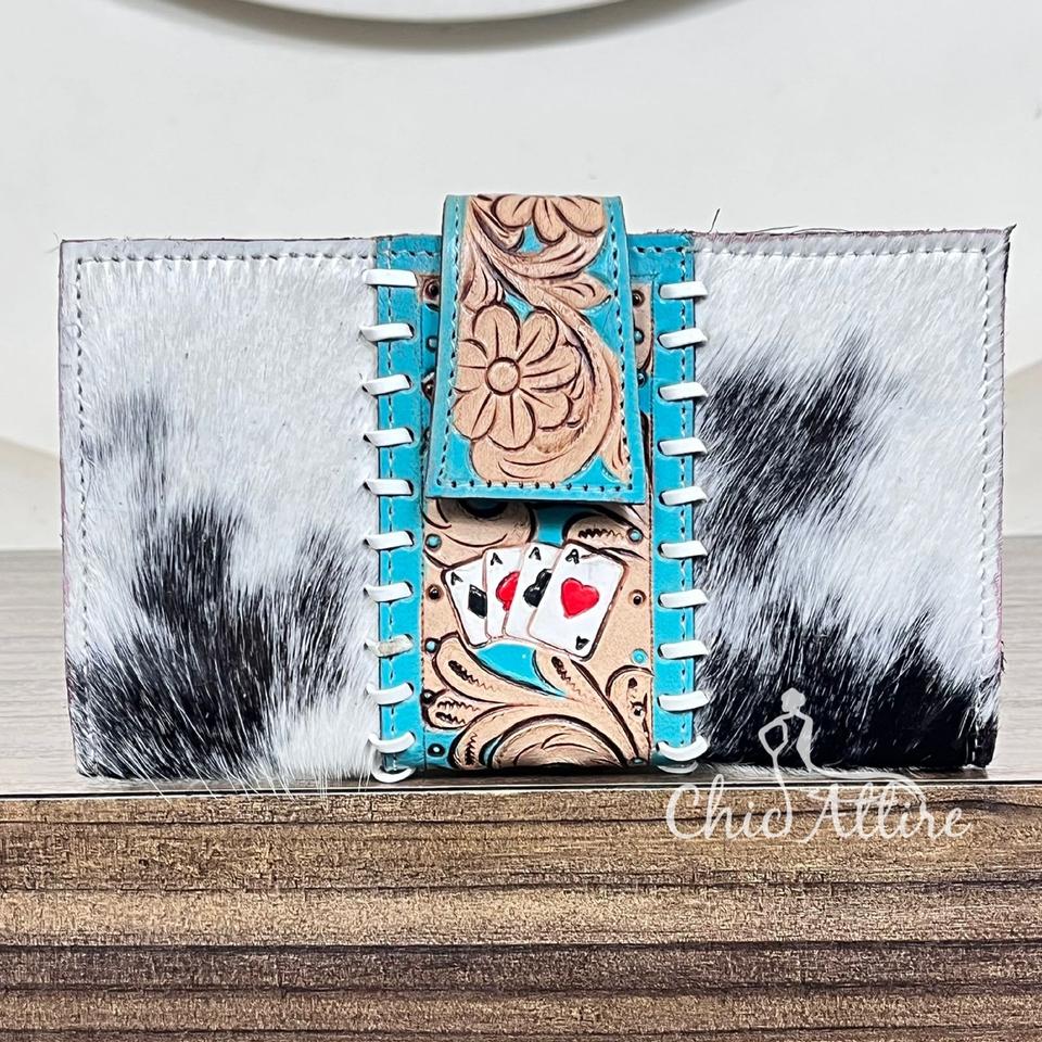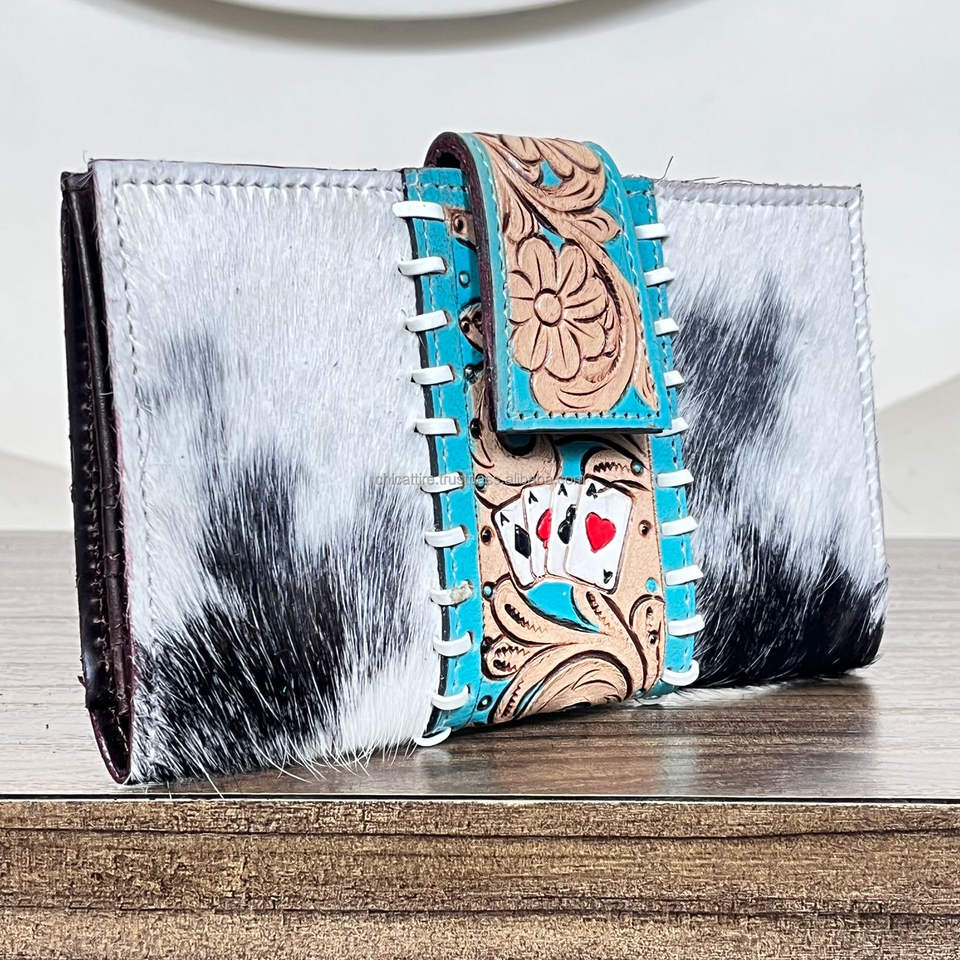 กระเป๋าสตางค์หนังแท้สไตล์ตะวันตกสำหรับผู้หญิงกระเป๋าคลัทช์สำหรับเล่นลายดอกไม้หนังเทอร์ควอยส์
