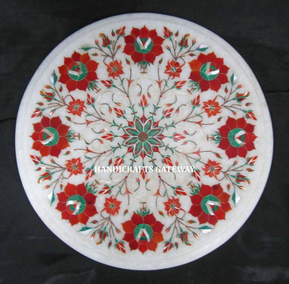 โต๊ะหินอ่อนสีขาวแบบฝังลายดอกไม้สีแดงงานหัตถกรรมอินเดียทำมือสวยงามทรงกลมทำด้วยมือ