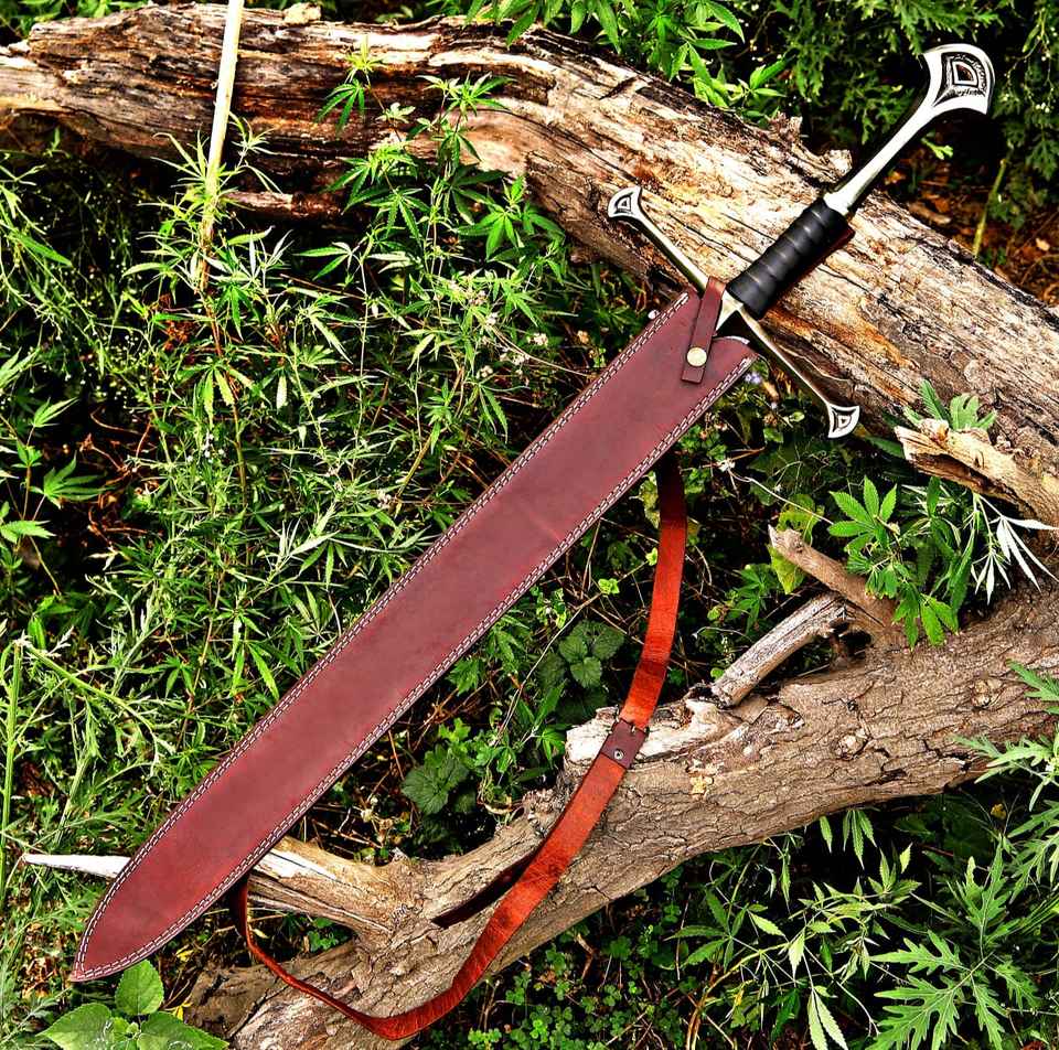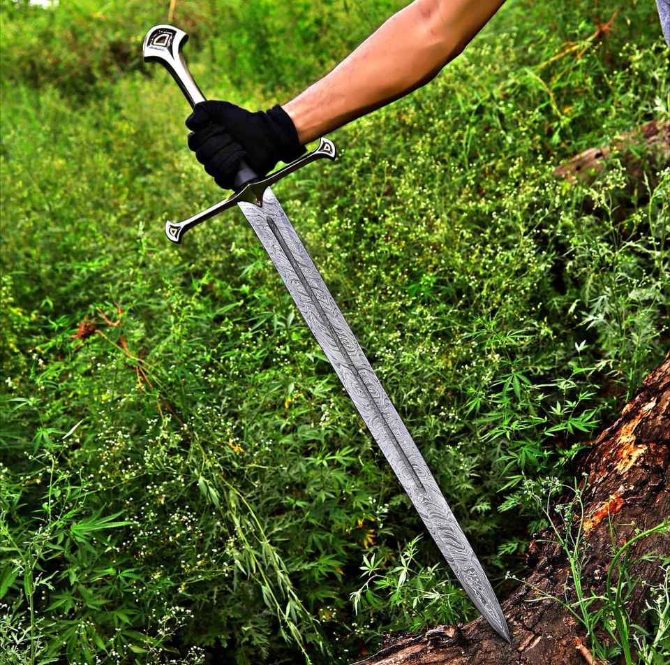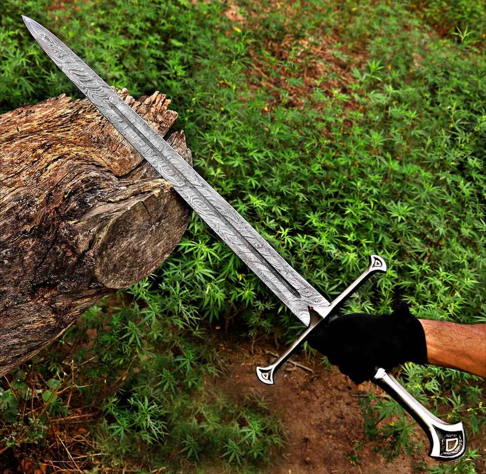 ดาบไวกิ้งเหล็กดามัสกัสคุณภาพสูง งานแฮนด์เมด ตีขึ้นรูปด้วยมือ ขายส่งยอดนิยม สำหรับการเอาตัวรอดกลางแจ้งและตั้งแคมป์ พร้อมปลอกดาบ