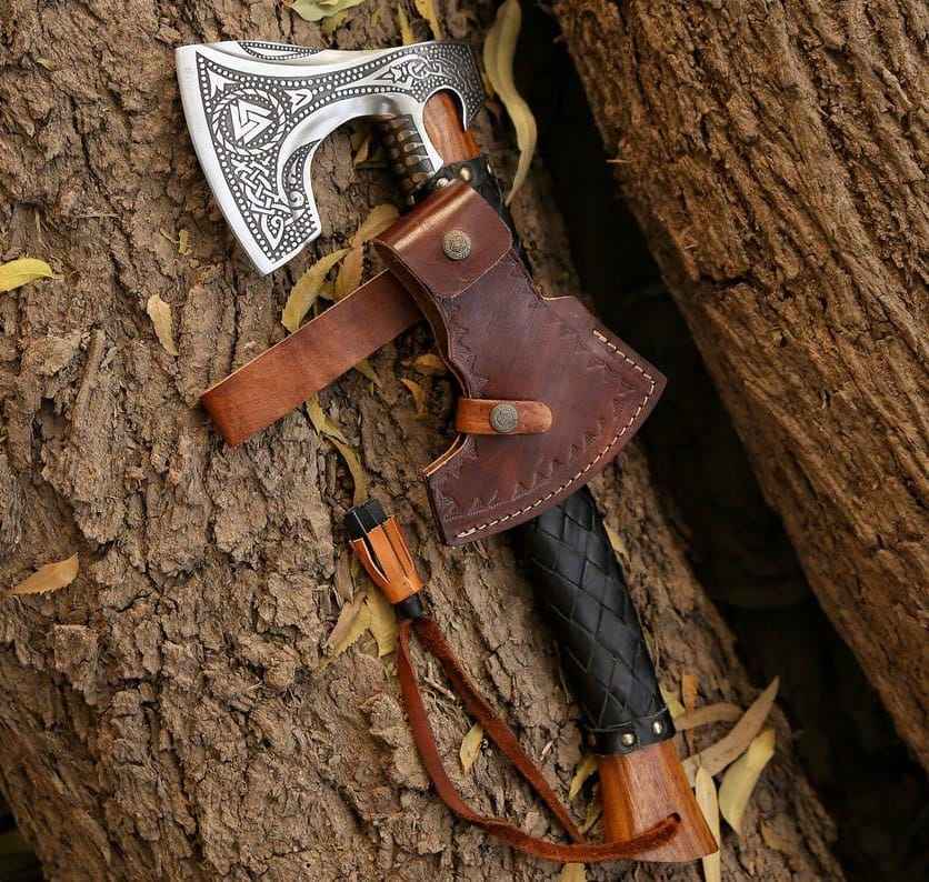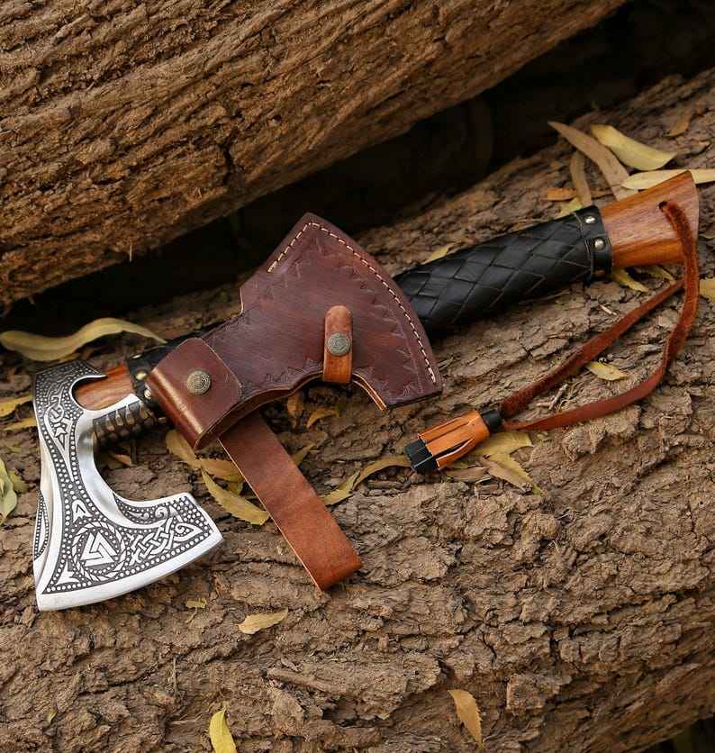 ขวานเหล็กกล้าคาร์บอนสูงขายดีราคาส่ง คุณภาพพรีเมียมระดับอุตสาหกรรม แบบไวกิ้ง สำหรับกิจกรรมกลางแจ้ง พร้อมปลอกหนังอย่างดี