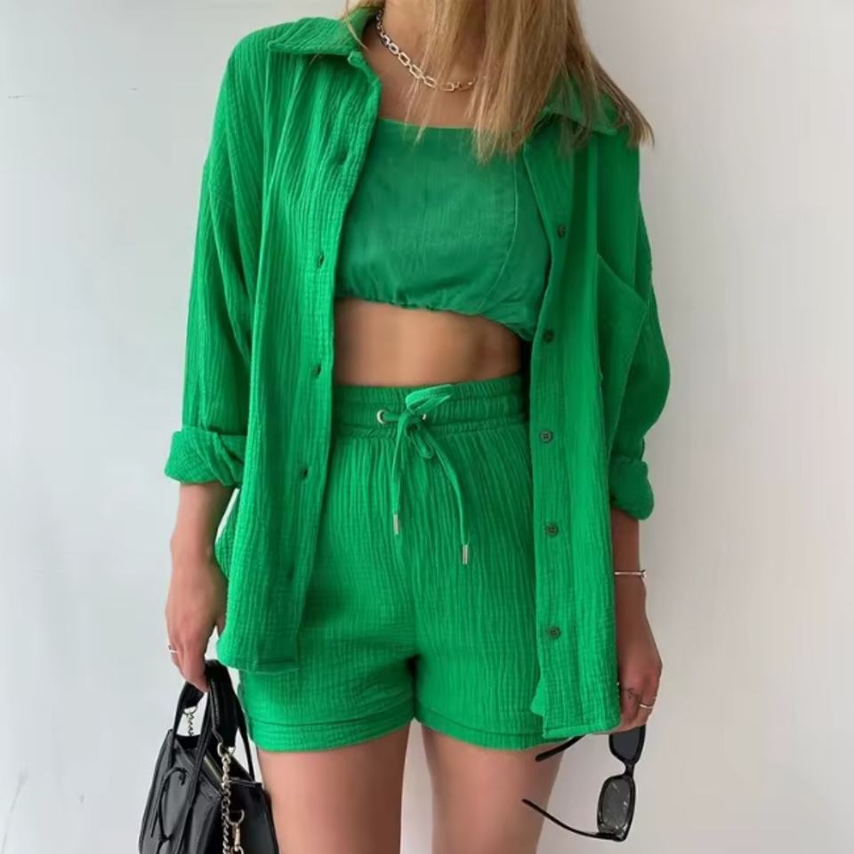 ชุดเซ็ตผู้หญิงขายดี ชุดลำลองสองชิ้น เสื้อแขนยาวสีพื้น กางเกงขาสั้นรูดเชือก