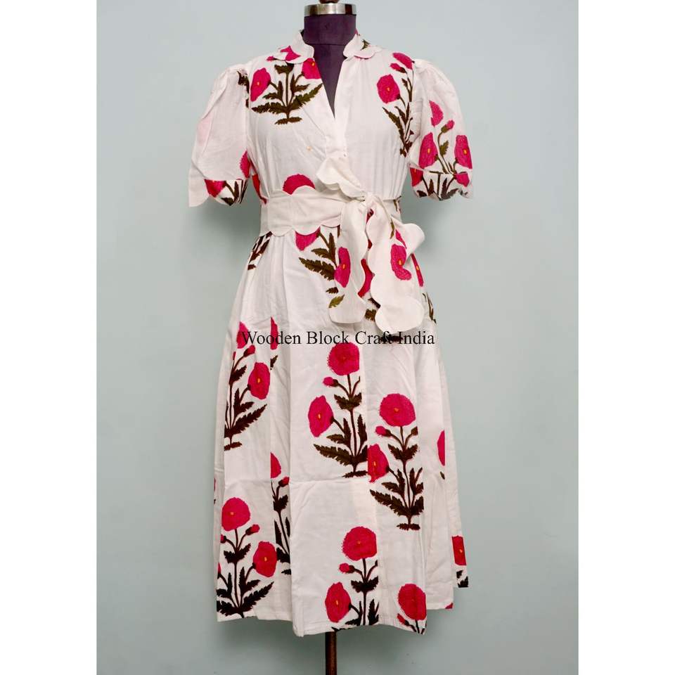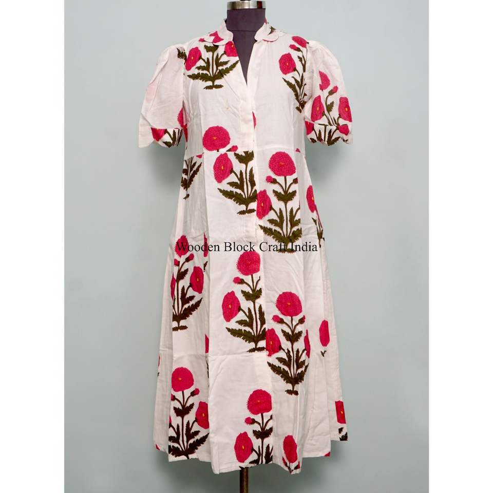 เดรสผู้หญิงขายดี ผ้าฝ้าย 100% ความยาวปานกลาง เป็นมิตรต่อสิ่งแวดล้อม ซักได้ ทำความสะอาดง่าย ระบายอากาศดี ติดกระดุมด้านหลัง ลายพิมพ์ คอวี แขนสั้น