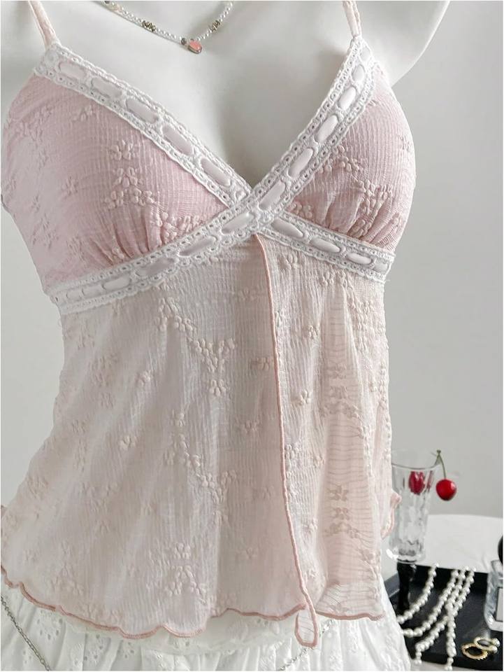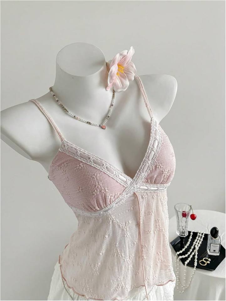 เสื้อสายเดี่ยวปักลายดอกไม้สำหรับผู้หญิงขายดี คอวี สายสปาเก็ตตี้ ผ้าบางเบา แฟชั่นเสื้อกั๊ก