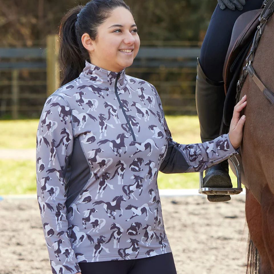 เสื้อผ้าขี่ม้าของผู้หญิงเสื้อฝึกขี่ม้าชั้นฐานแขนยาวทำจากผ้าให้เป็นเส้นๆ