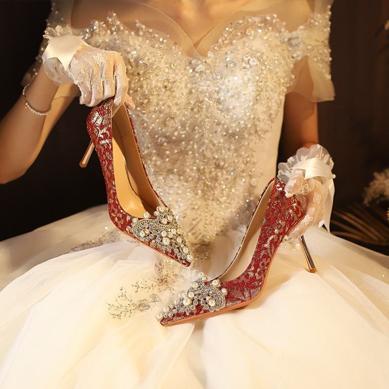 รองเท้าส้นเข็มสุดเซ็กซี่ของผู้หญิง2025เจ้าสาวหรูหราสไตล์ใหม่รองเท้าแต่งงานส้นสูงสีแดง