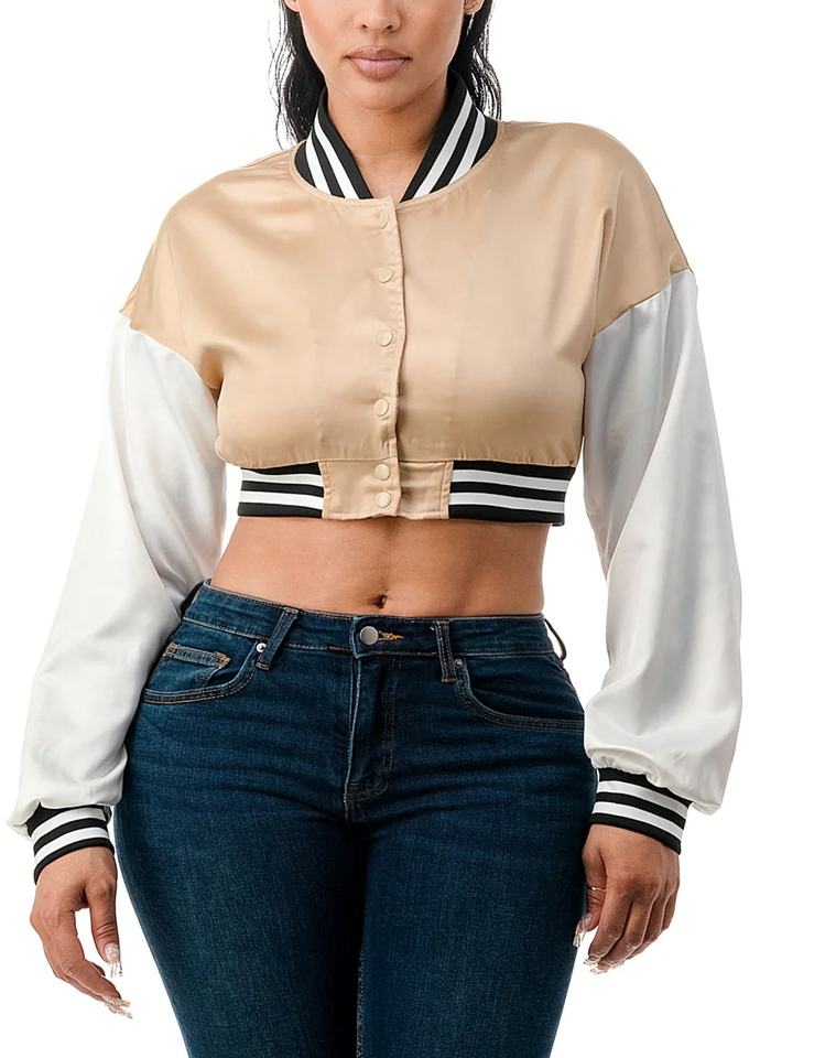 แจ็คเก็ตซาตินครอปแฟชั่นสำหรับผู้หญิง ขายดี แขนยาว คอตั้ง ผ้าไหมแท้ 100% รับสกรีนโลโก้ แจ็คเก็ตซาตินสไตล์วาร์ซิตี้สำหรับผู้หญิง