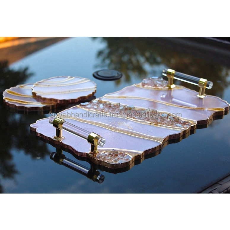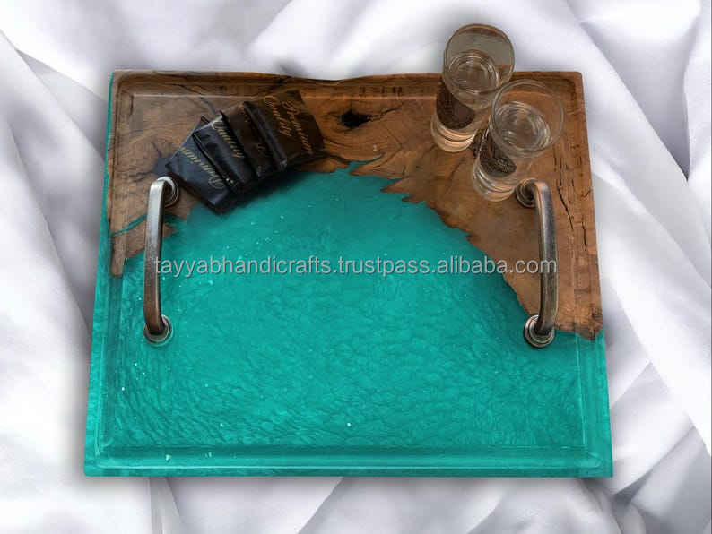 ถาดเสิร์ฟไม้และเรซินพร้อมจานรองแก้วสีดำวอลนัทพร้อมถาดตกแต่งอีพ็อกซี่เรซิน