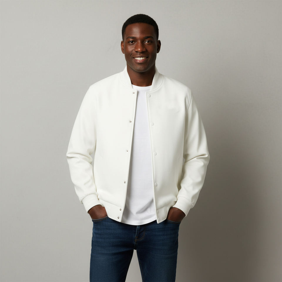 แจ็คเก็ตวาร์ซิตี้ผ้าแคนวาสสำหรับผู้ชายขายดี รุ่นหนาสำหรับฤดูหนาว สีขาวล้วน พร้อมปักโลโก้ด้านหน้า สวมใส่สบาย อุ่น และระบายอากาศได้ดี