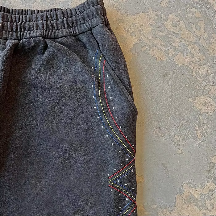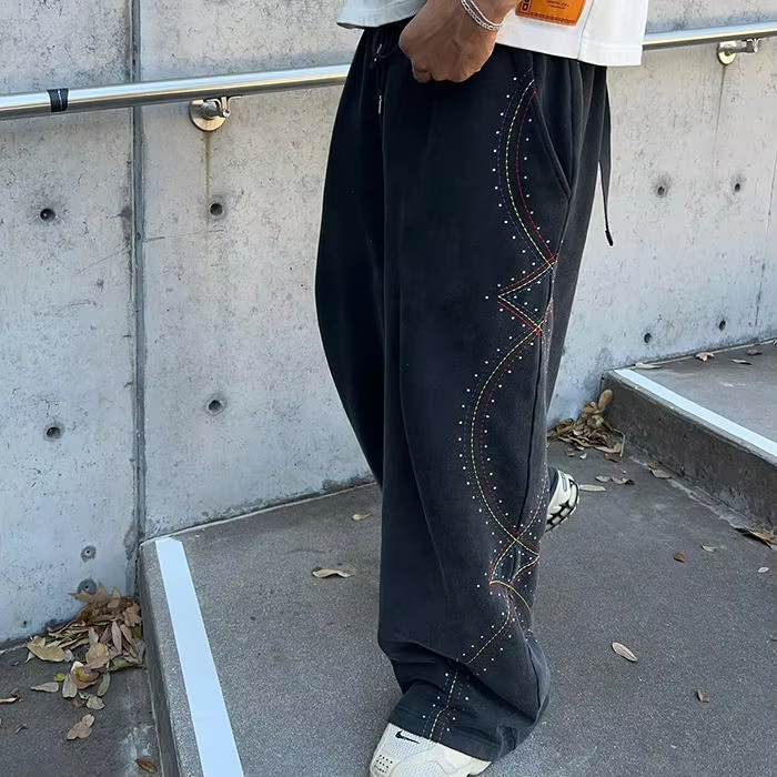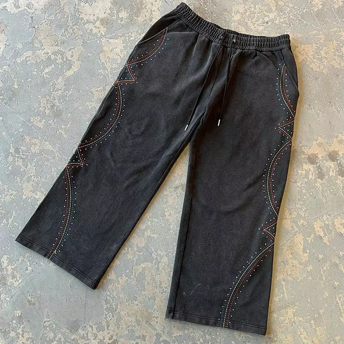 กางเกงวอร์มผ้าคอตตอนลายทางทรงโค้งสำหรับผู้ชายกางเกงวิ่งขาตรงประดับพลอยเทียมขนาดใหญ่ใส่ได้ทั้งชายและหญิง