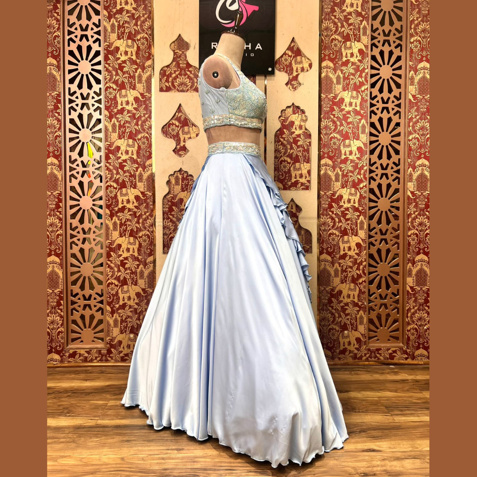 Lehenga สีน้ำเงินท้องฟ้าสุดฮอตพร้อมเลื่อมและประณีตและเดรสทำงานด้วยมืออันประณีตฟังก์ชั่นงานแต่งงานและงานรื่นเริงจากอินเดีย