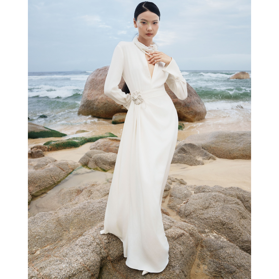 เดรสเทรนช์สุดหรูสำหรับผู้หญิงคอกลมชุดแม็กซี่ประดับด้วย2025ฤดูใบไม้ผลิที่มีคุณภาพดีสีขาว