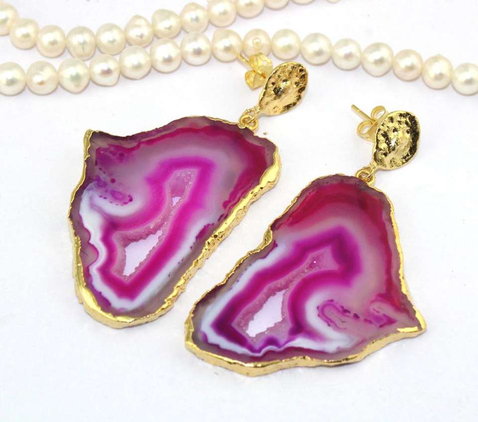 เครื่องประดับขายส่งร้อนร้อนสีชมพู Geode Druzy ชิ้นต่างหูทำด้วยมือลดลงห้อยทองเหลืองชุบทองแขวนต่างหู